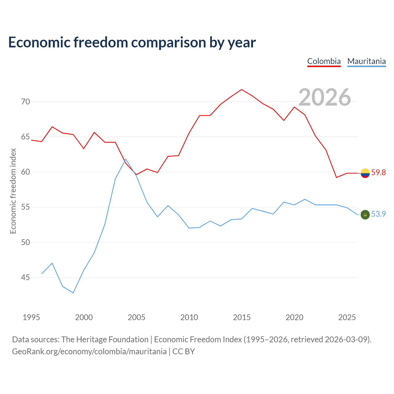 Data sources: The Heritage Foundation | Economic Freedom Index (1995–2026, retrieved 2026-03-09).