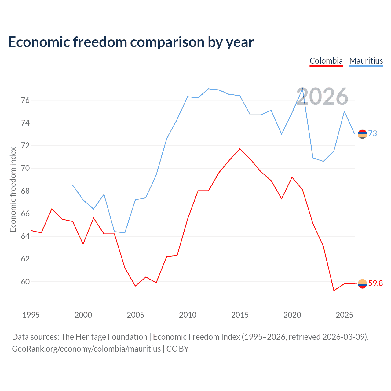 The Economic Freedom Index for Colombia is 59.8, ranking 101/197, compared to 73 for Mauritius, ranking 26/197. The chart above displays a comparison of annual changes in economic freedom indexes.