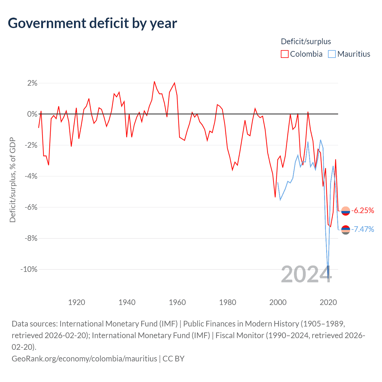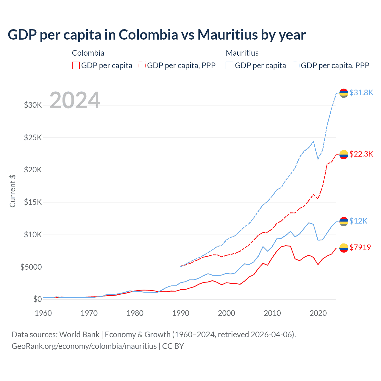 Colombia has a GDP of $419B compared to $14.9B for Mauritius, ranking 39/197 and 143/197 by economy size, respectively.