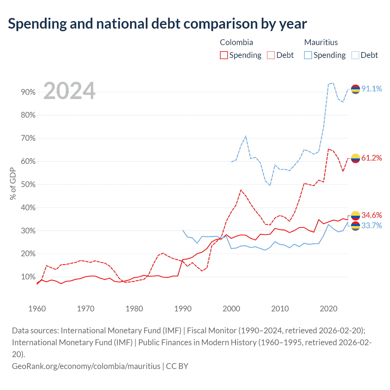 Colombia has $256B in government debt (61.2% of GDP), compared to $13.6B (91.1% of GDP) in Mauritius.