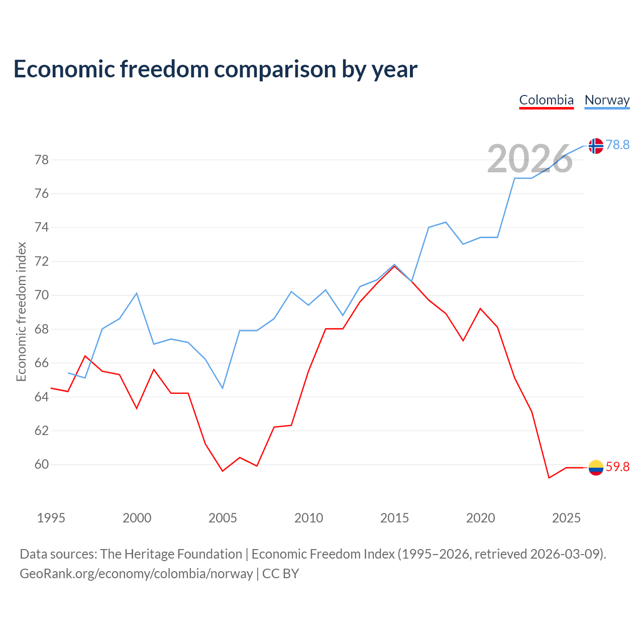 The Economic Freedom Index for Colombia is 59.8, ranking 101/197, compared to 78.8 for Norway, ranking 9/197. The chart above displays a comparison of annual changes in economic freedom indexes.
