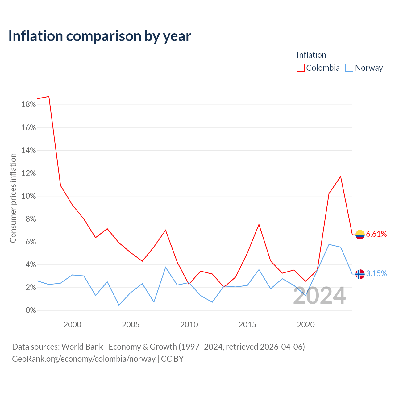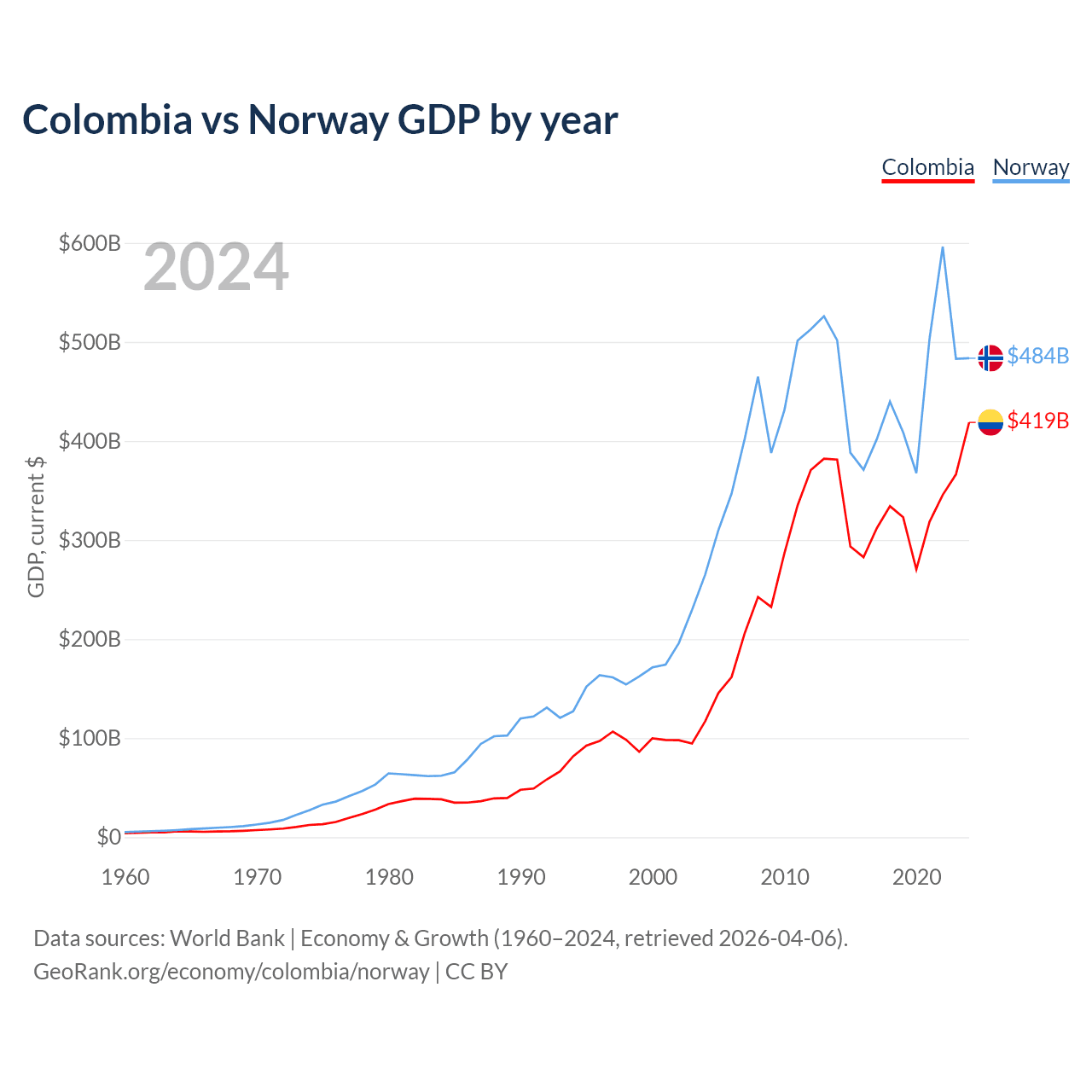 Colombia has a GDP of $419B compared to $484B for Norway, ranking 39/197 and 32/197 by economy size, respectively.