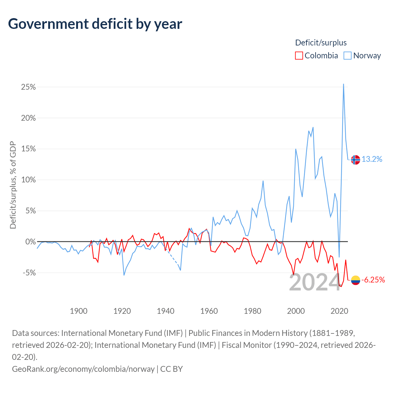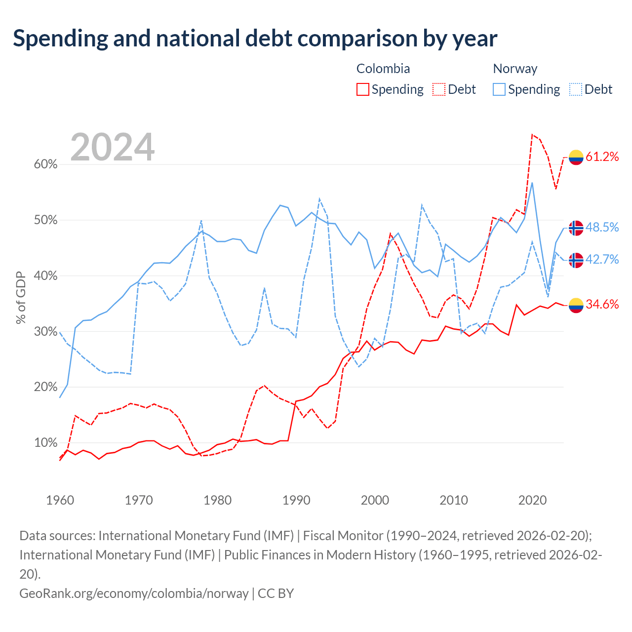 Colombia has $256B in government debt (61.2% of GDP), compared to $207B (42.7% of GDP) in Norway.