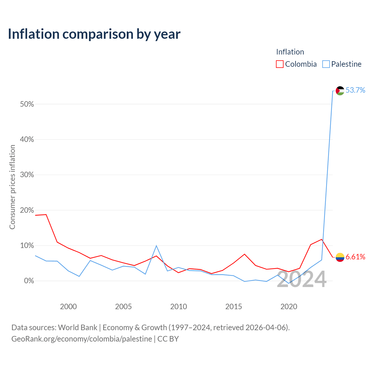 Colombia has a GDP of $419B compared to $13.7B for Palestine, ranking 39/197 and 146/197 by economy size, respectively.