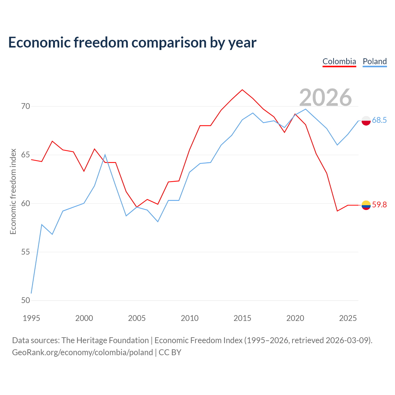 The Economic Freedom Index for Colombia is 59.8, ranking 101/197, compared to 68.5 for Poland, ranking 46/197. The chart above displays a comparison of annual changes in economic freedom indexes.