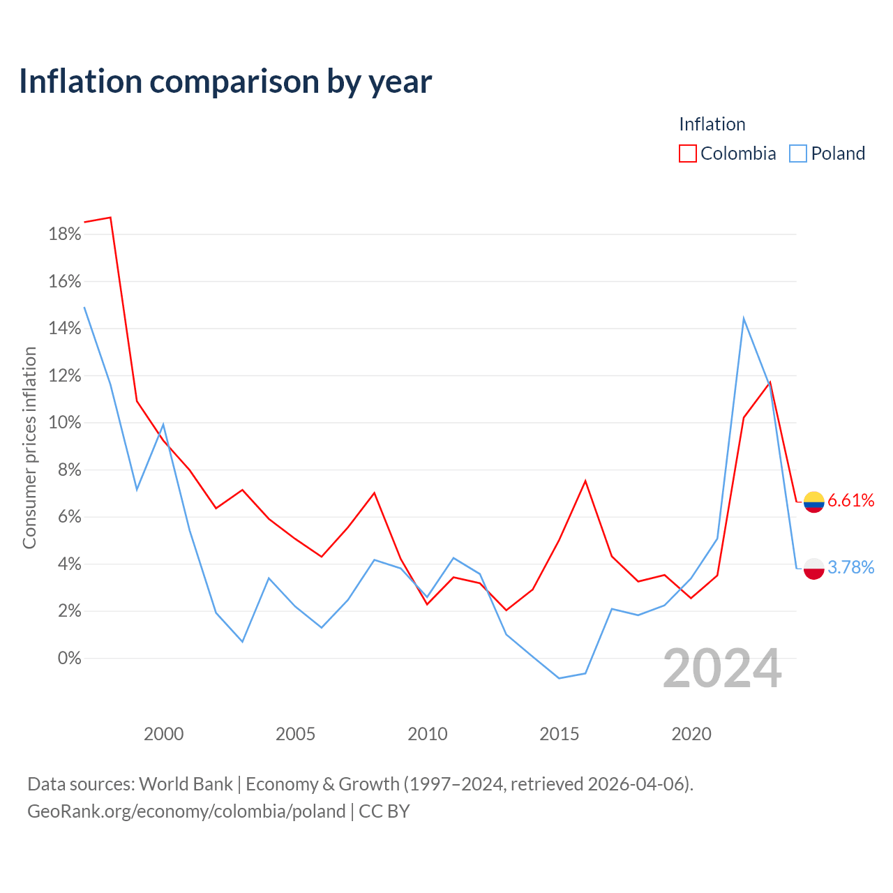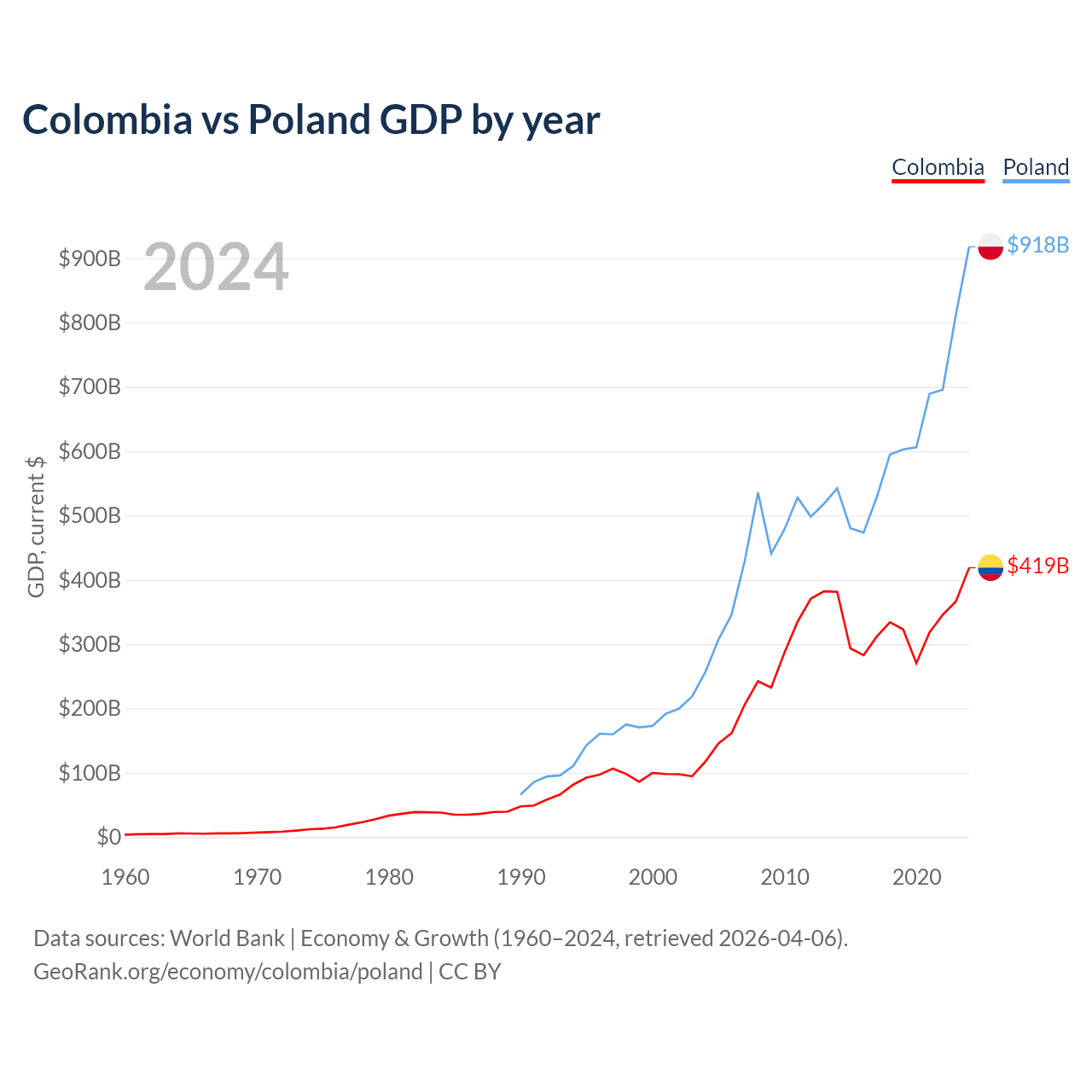 Colombia has a GDP of $419B compared to $918B for Poland, ranking 39/197 and 21/197 by economy size, respectively.