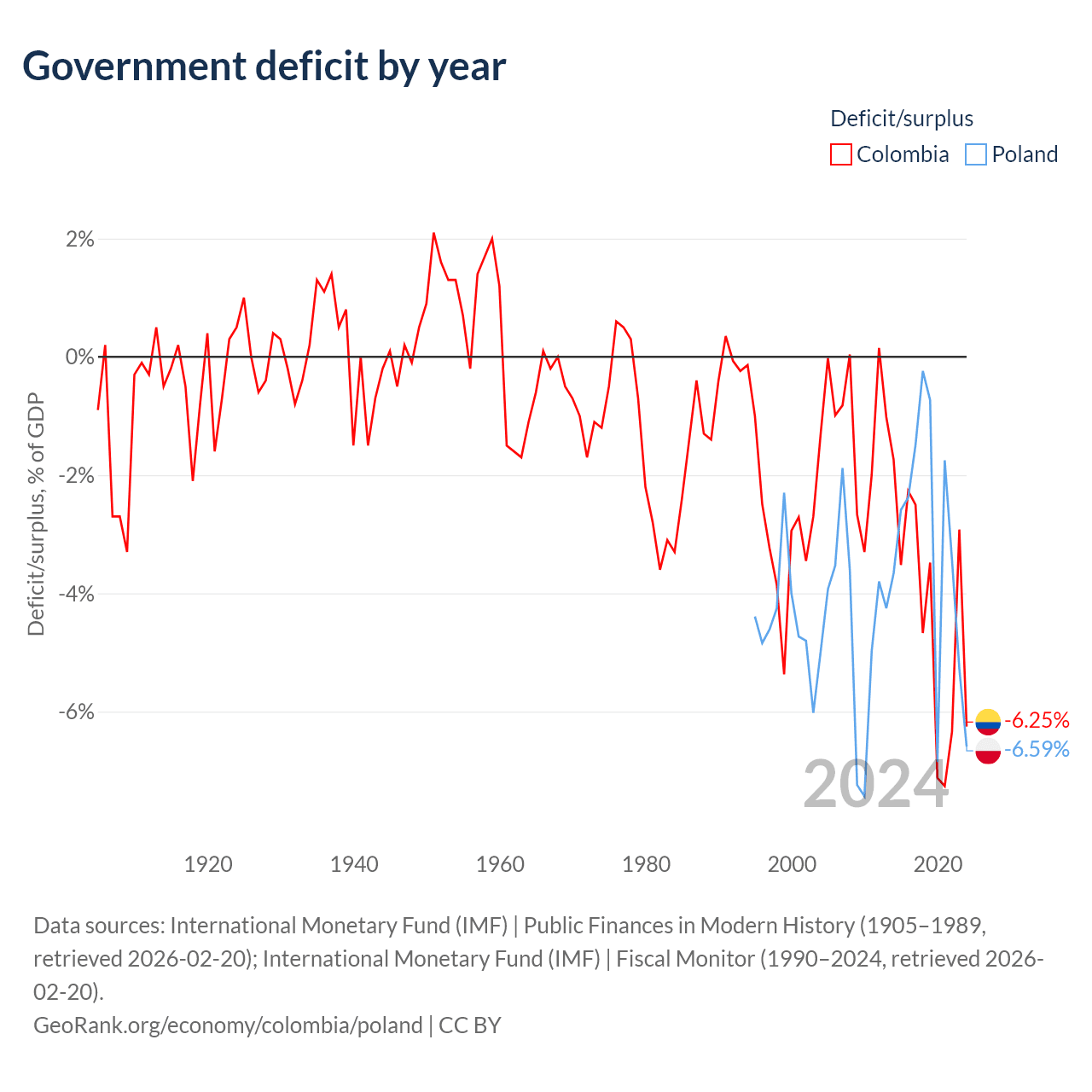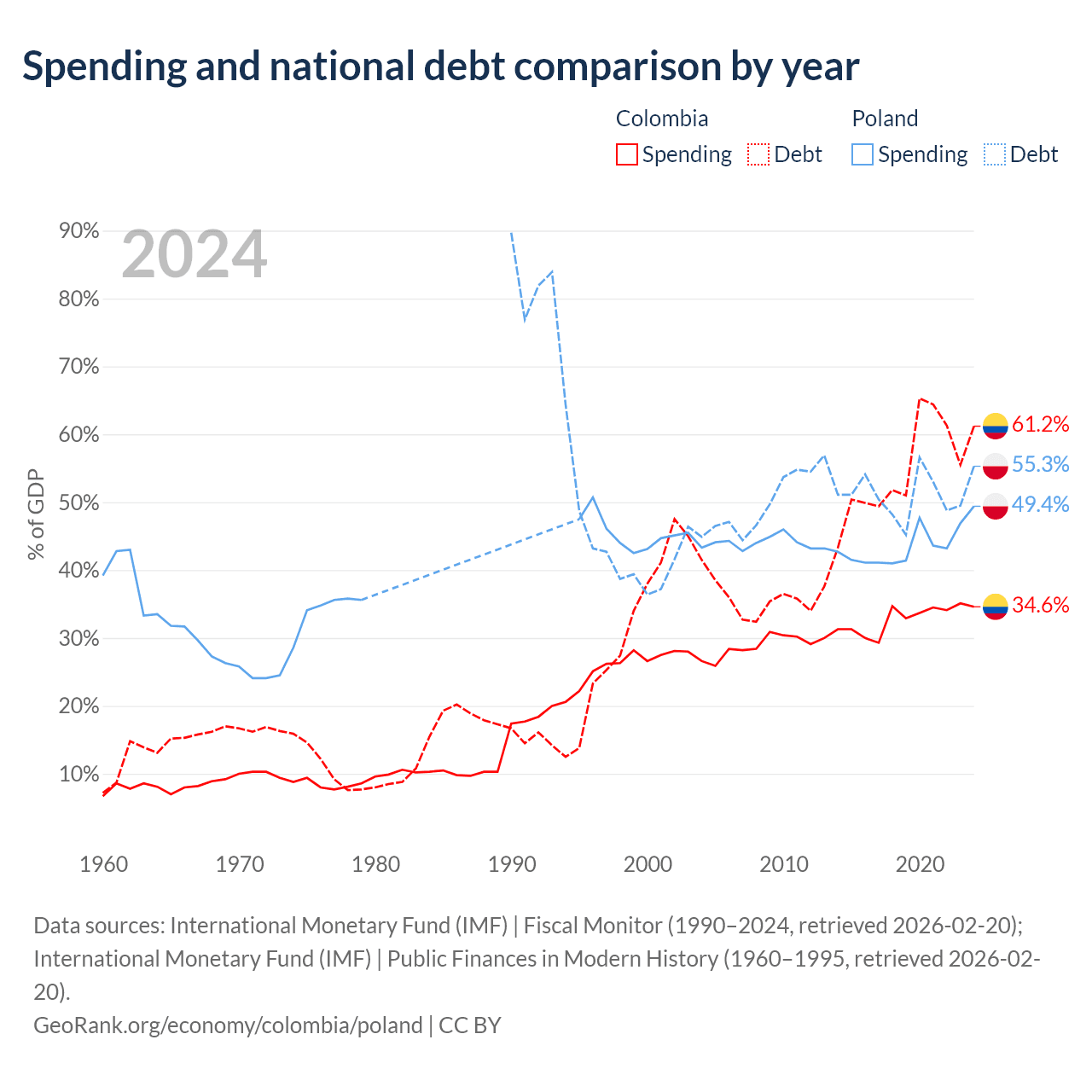 Colombia has $256B in government debt (61.2% of GDP), compared to $507B (55.3% of GDP) in Poland.
