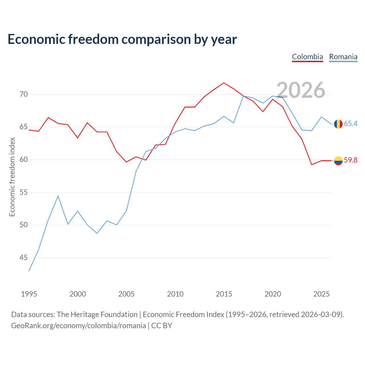 The Economic Freedom Index for Colombia is 59.8, ranking 101/197, compared to 65.4 for Romania, ranking 64/197. The chart above displays a comparison of annual changes in economic freedom indexes.