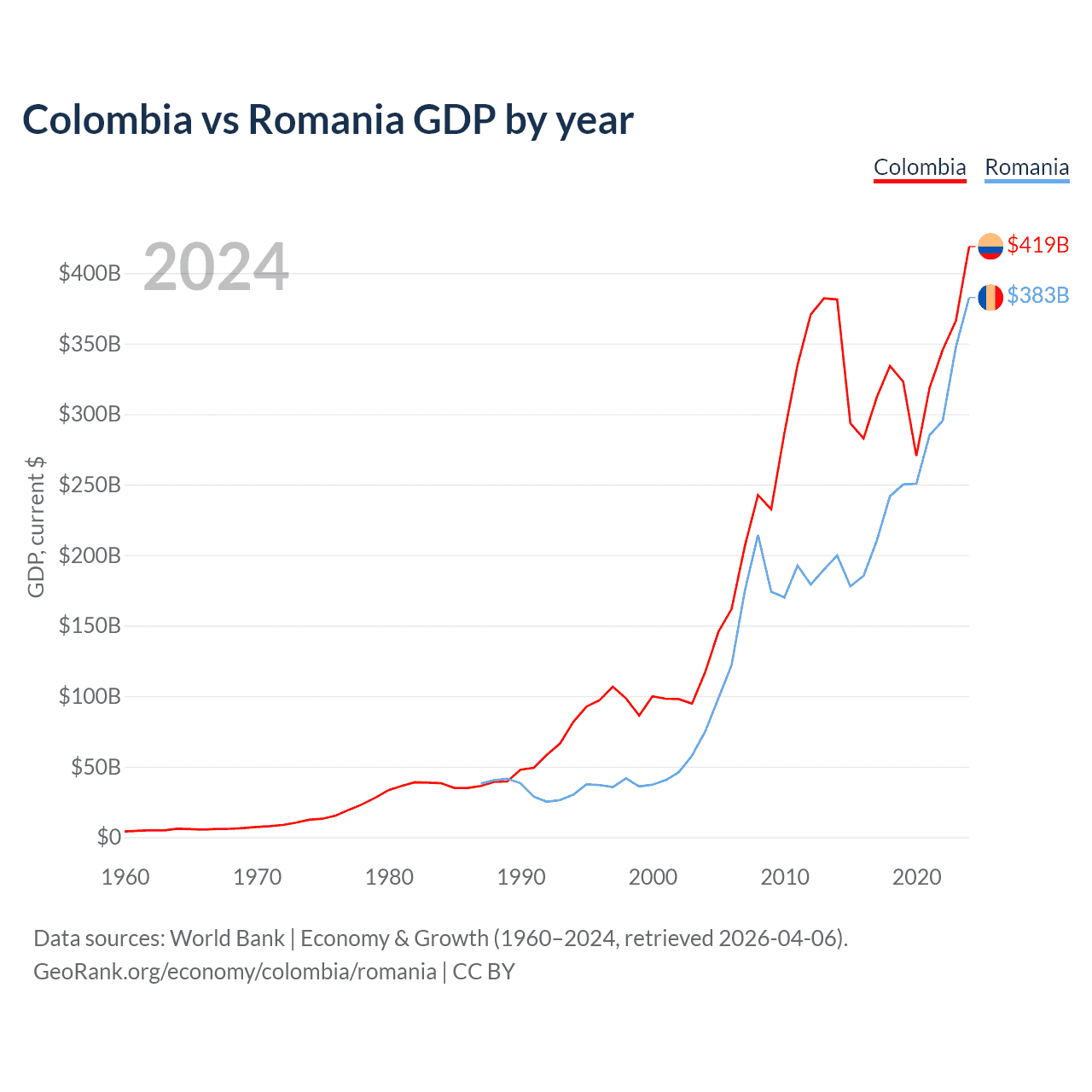 Colombia vs Romania GDP by year