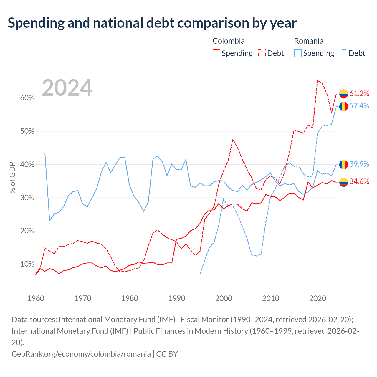 Colombia has $256B in government debt (61.2% of GDP), compared to $220B (57.4% of GDP) in Romania.