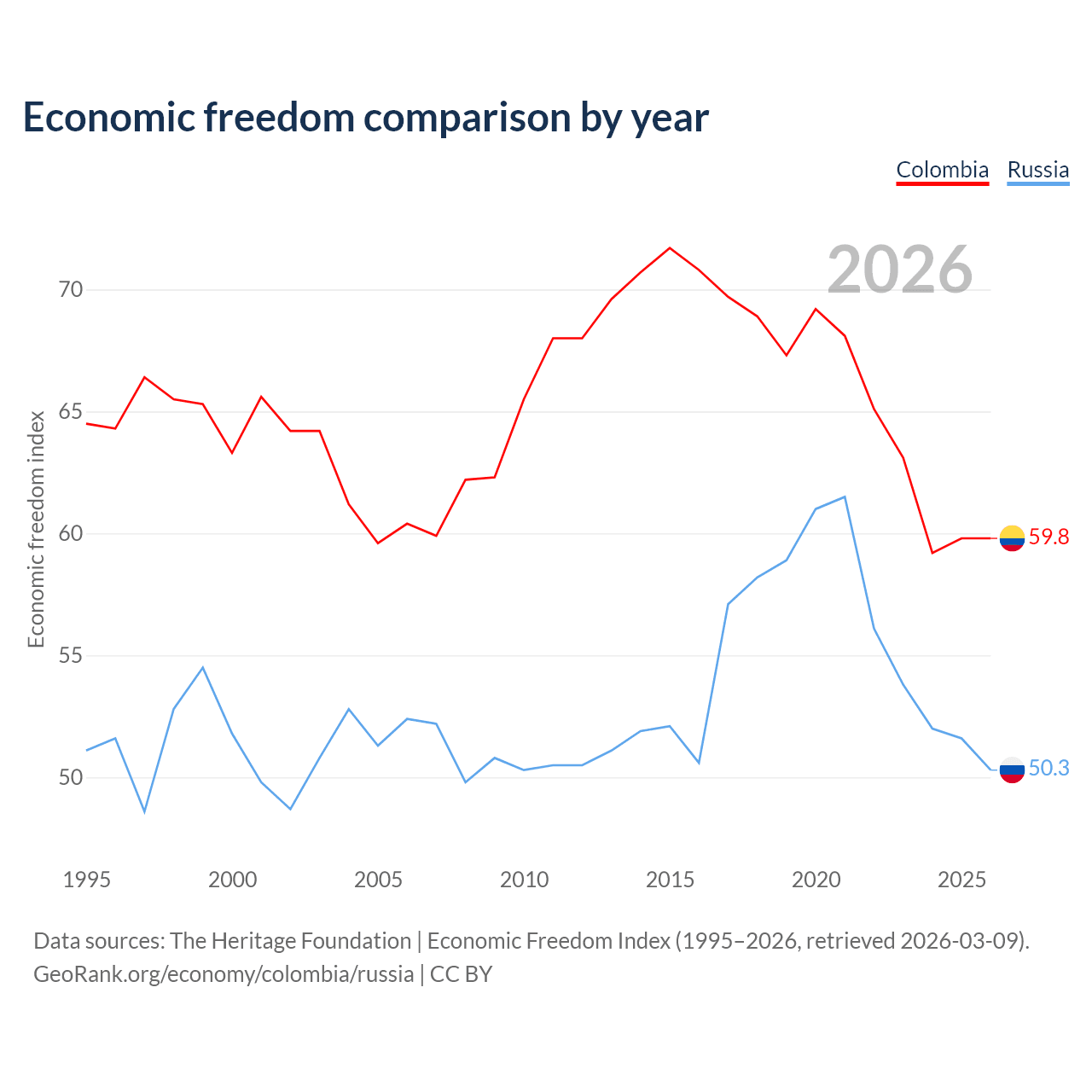The Economic Freedom Index for Colombia is 59.8, ranking 101/197, compared to 50.3 for Russia, ranking 161/197. The chart above displays a comparison of annual changes in economic freedom indexes.