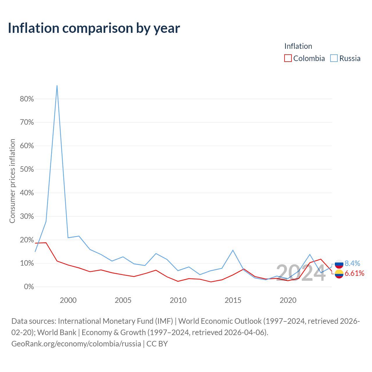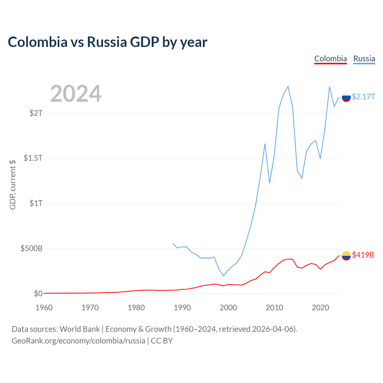 Colombia has a GDP of $419B compared to $2.17T for Russia, ranking 39/197 and 11/197 by economy size, respectively.