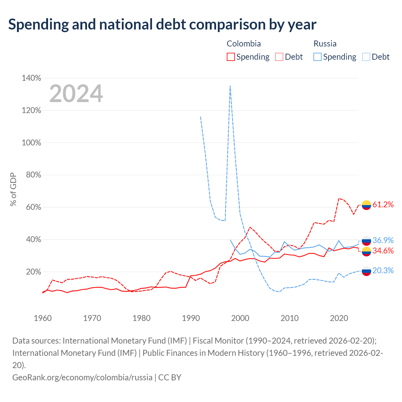 Colombia has $256B in government debt (61.2% of GDP), compared to $440B (20.3% of GDP) in Russia.