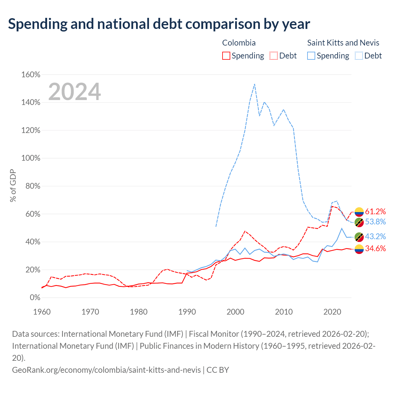 Colombia has $256B in government debt (61.2% of GDP), compared to $604M (53.8% of GDP) in Saint Kitts and Nevis.