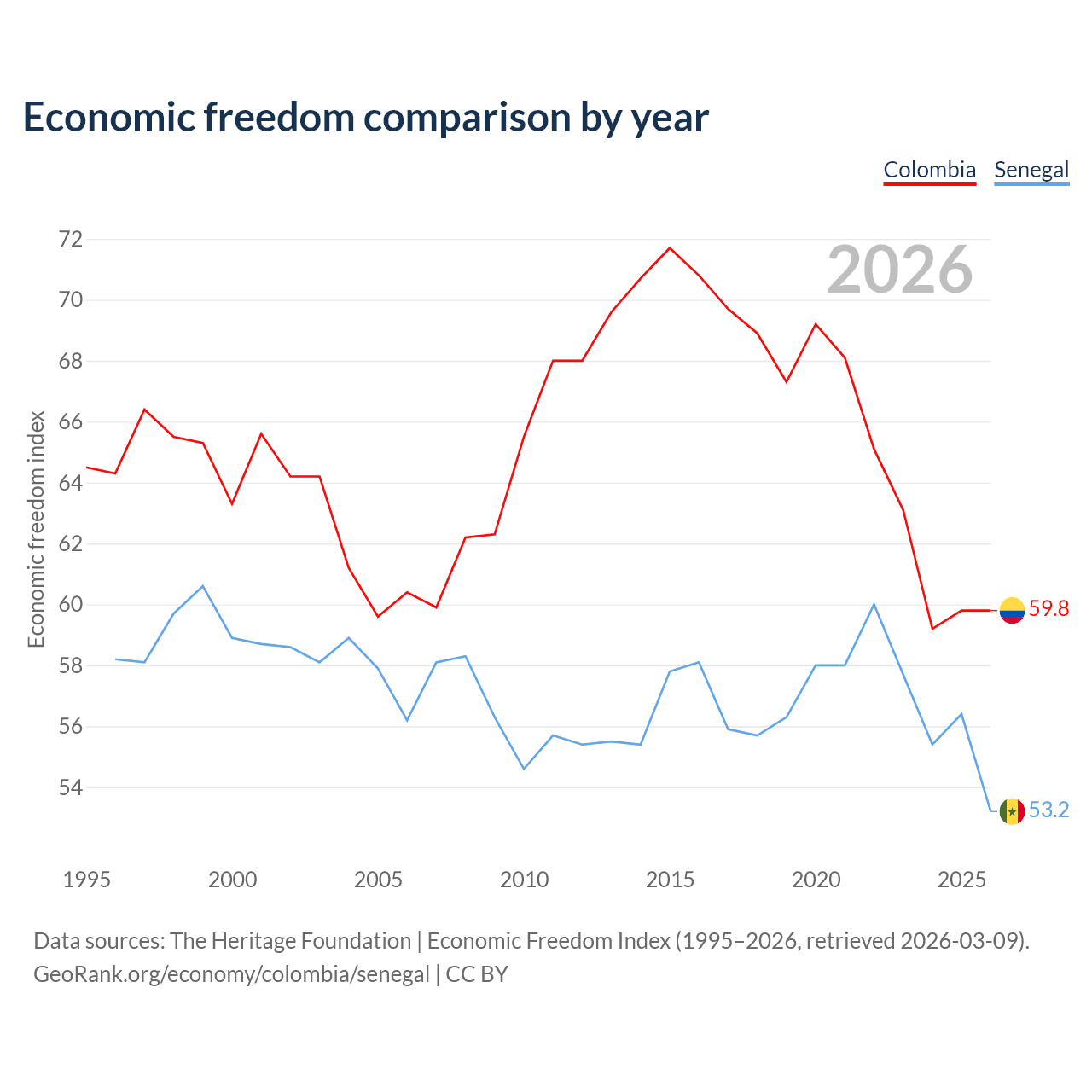 The Economic Freedom Index for Colombia is 59.8, ranking 101/197, compared to 53.2 for Senegal, ranking 140/197. The chart above displays a comparison of annual changes in economic freedom indexes.