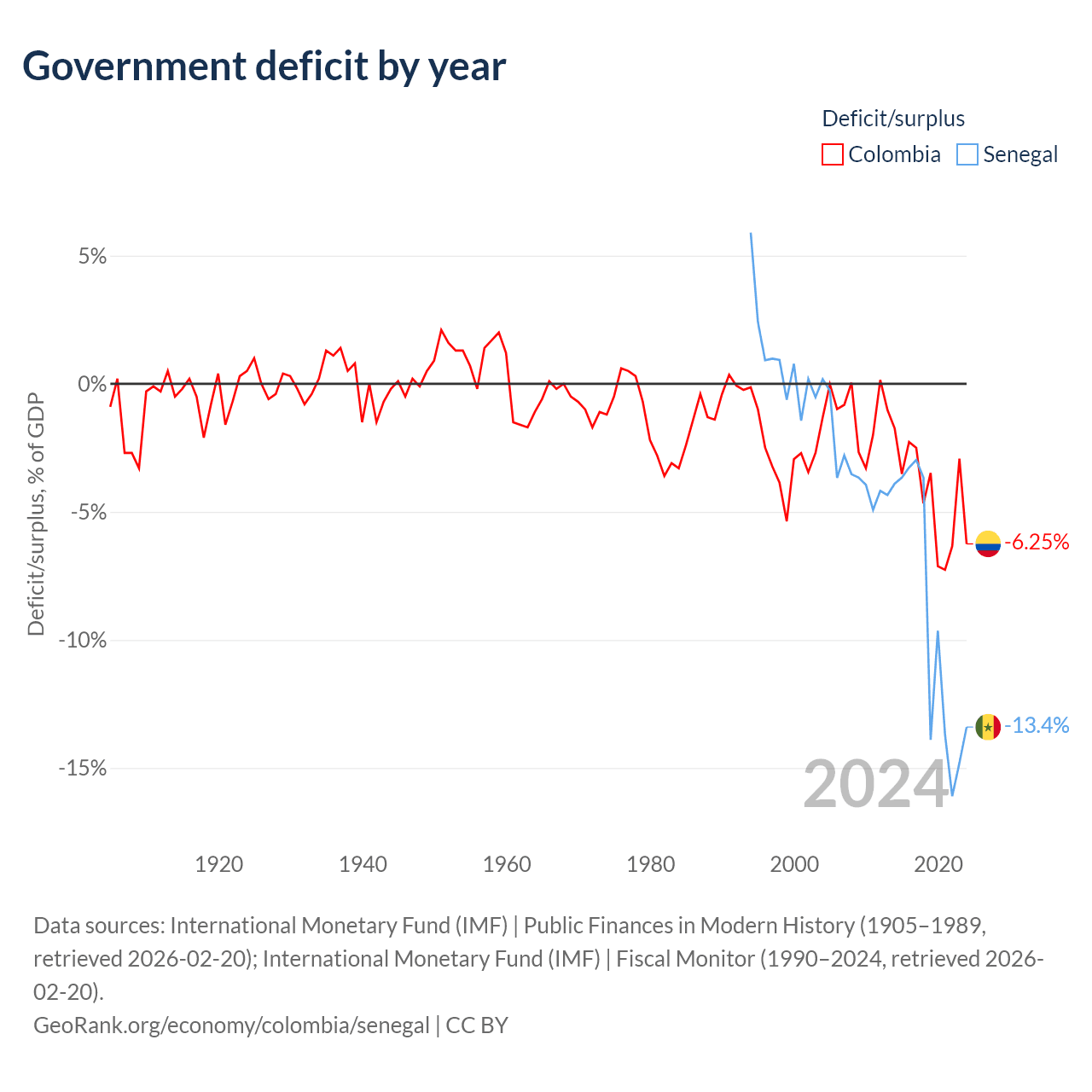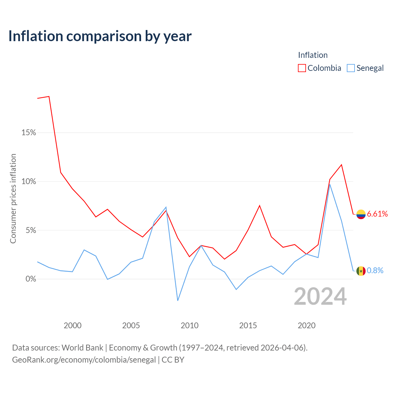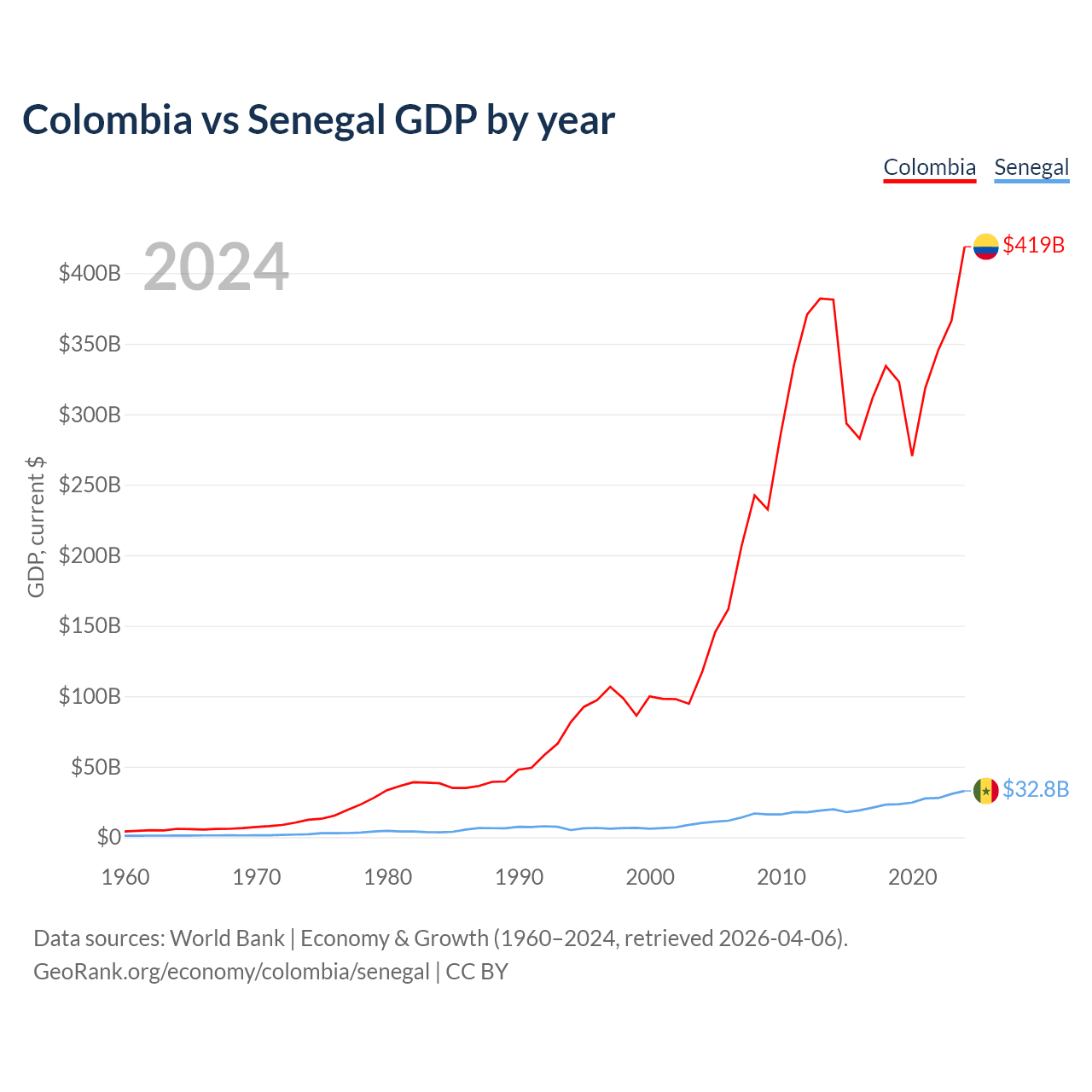 Colombia has a GDP of $419B compared to $32.8B for Senegal, ranking 39/197 and 109/197 by economy size, respectively.