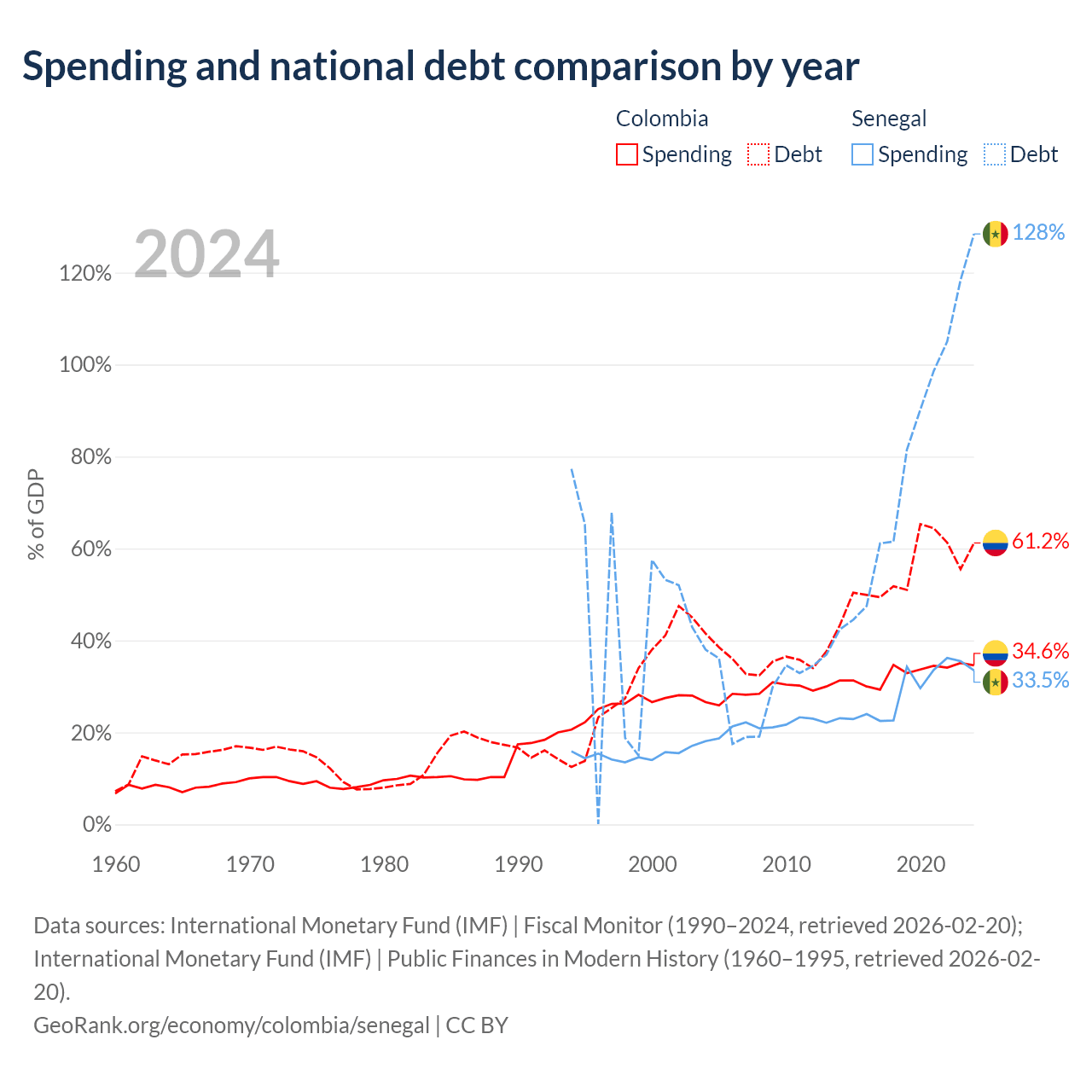 Colombia has $256B in government debt (61.2% of GDP), compared to $42.1B (128.4% of GDP) in Senegal.
