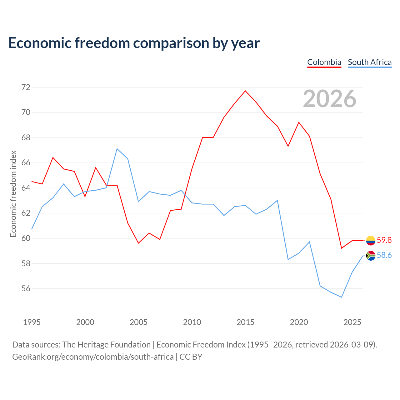 The Economic Freedom Index for Colombia is 59.8, ranking 101/197, compared to 58.6 for South Africa, ranking 110/197. The chart above displays a comparison of annual changes in economic freedom indexes.