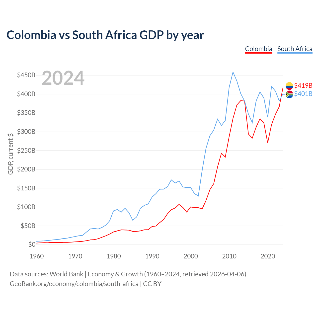 Colombia has a GDP of $419B compared to $401B for South Africa, ranking 39/197 and 40/197 by economy size, respectively.