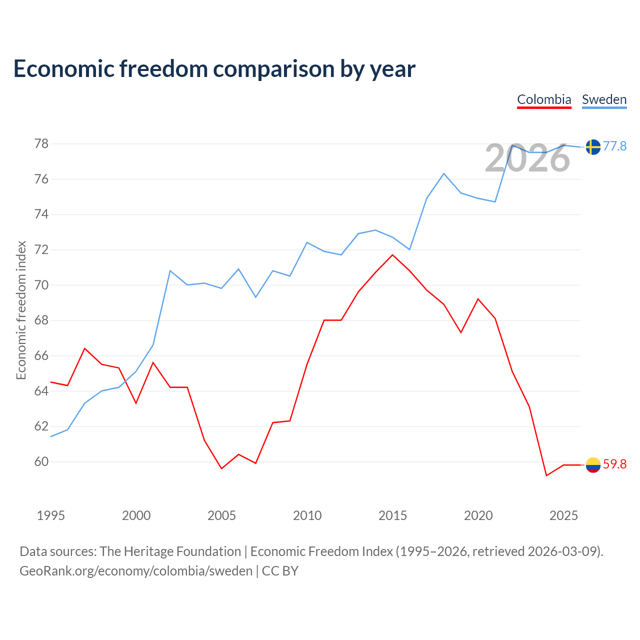 The Economic Freedom Index for Colombia is 59.8, ranking 101/197, compared to 77.8 for Sweden, ranking 14/197. The chart above displays a comparison of annual changes in economic freedom indexes.