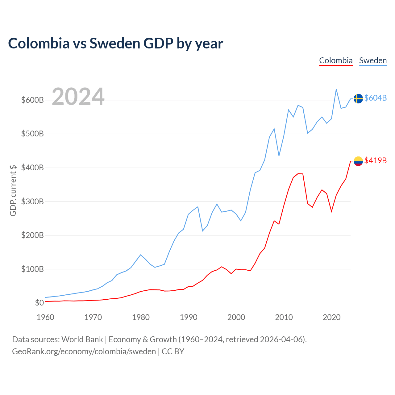 Colombia vs Sweden GDP by year