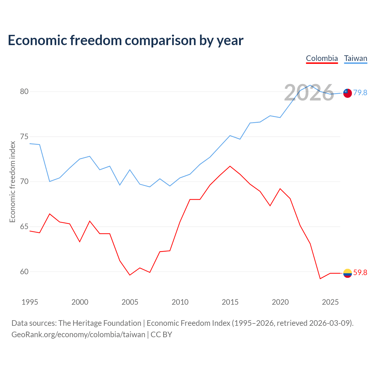 The Economic Freedom Index for Colombia is 59.8, ranking 101/197, compared to 79.8 for Taiwan, ranking 6/197. The chart above displays a comparison of annual changes in economic freedom indexes.