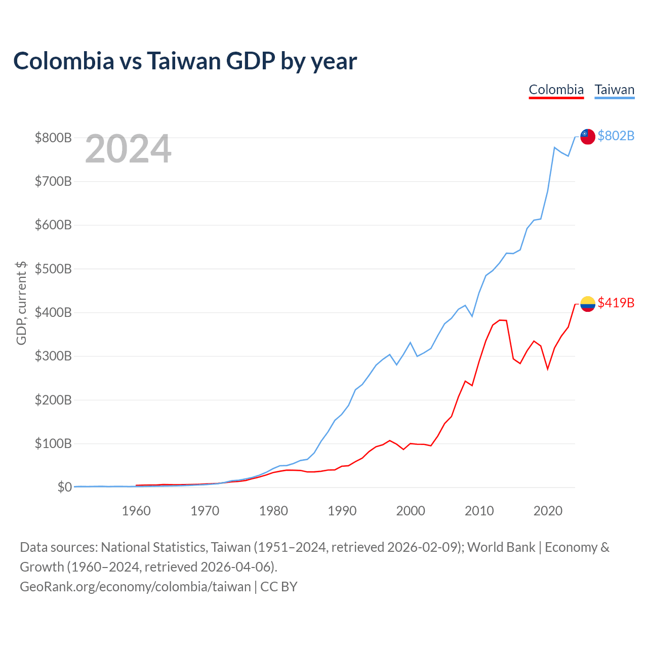 Colombia has a GDP of $419B compared to $802B for Taiwan, ranking 39/197 and 22/197 by economy size, respectively.