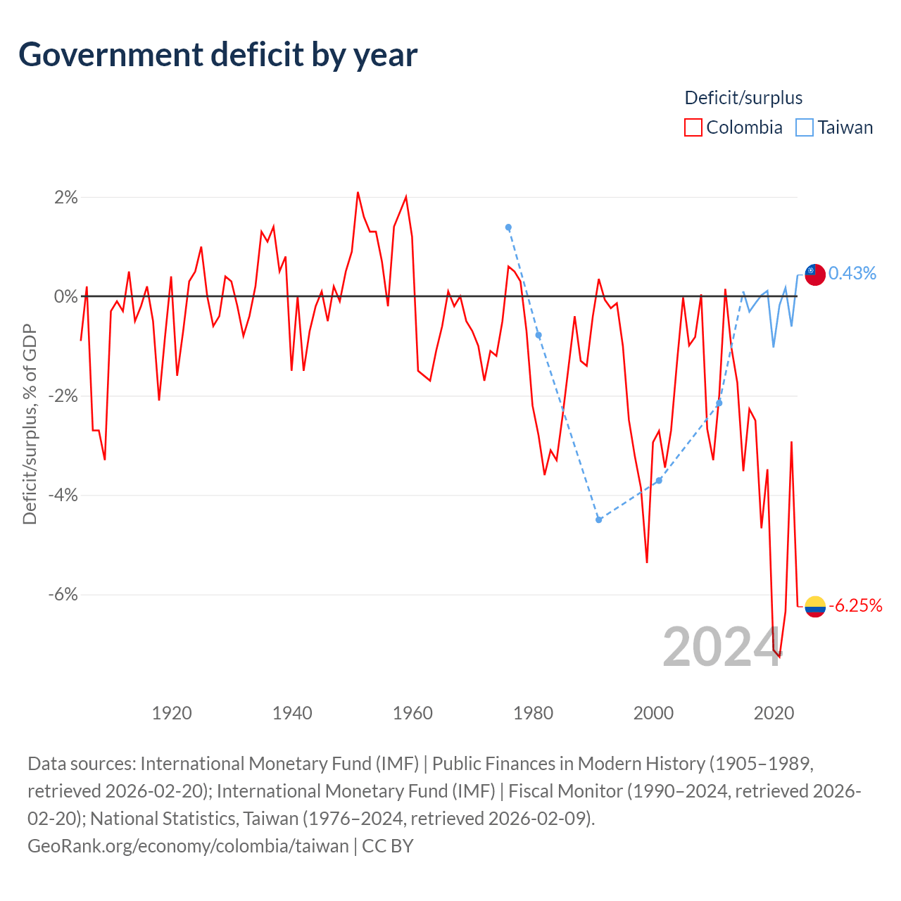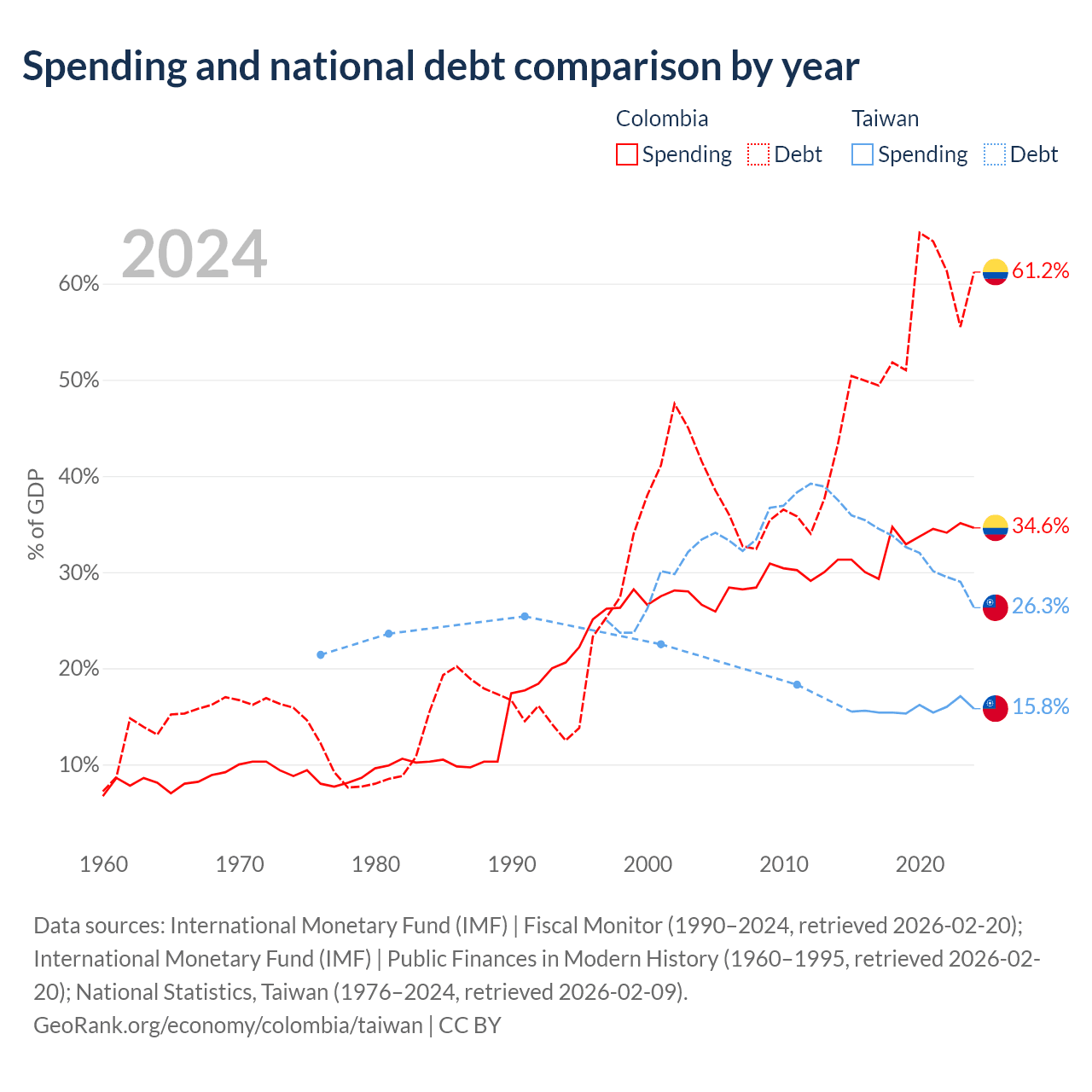Colombia has $256B in government debt (61.2% of GDP), compared to $211B (26.3% of GDP) in Taiwan.