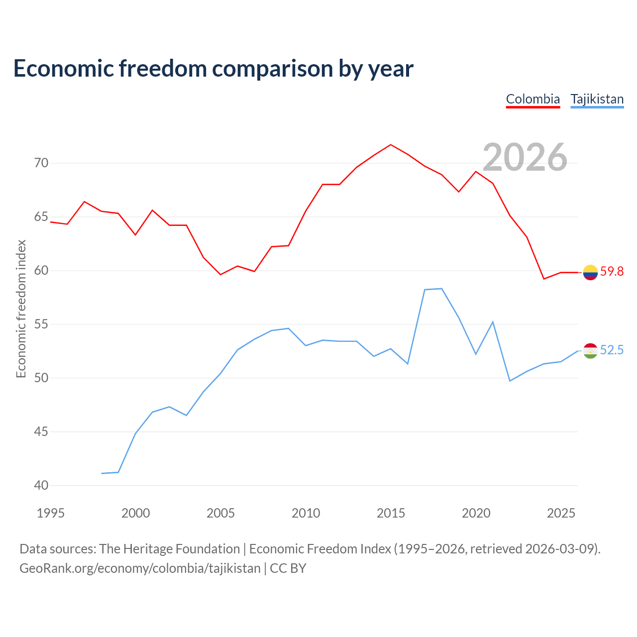 The Economic Freedom Index for Colombia is 59.8, ranking 101/197, compared to 52.5 for Tajikistan, ranking 147/197. The chart above displays a comparison of annual changes in economic freedom indexes.