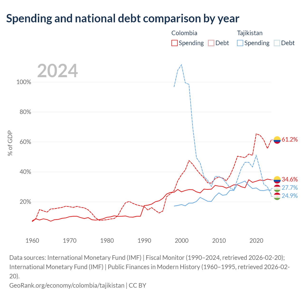 Colombia has $256B in government debt (61.2% of GDP), compared to $3.54B (24.9% of GDP) in Tajikistan.