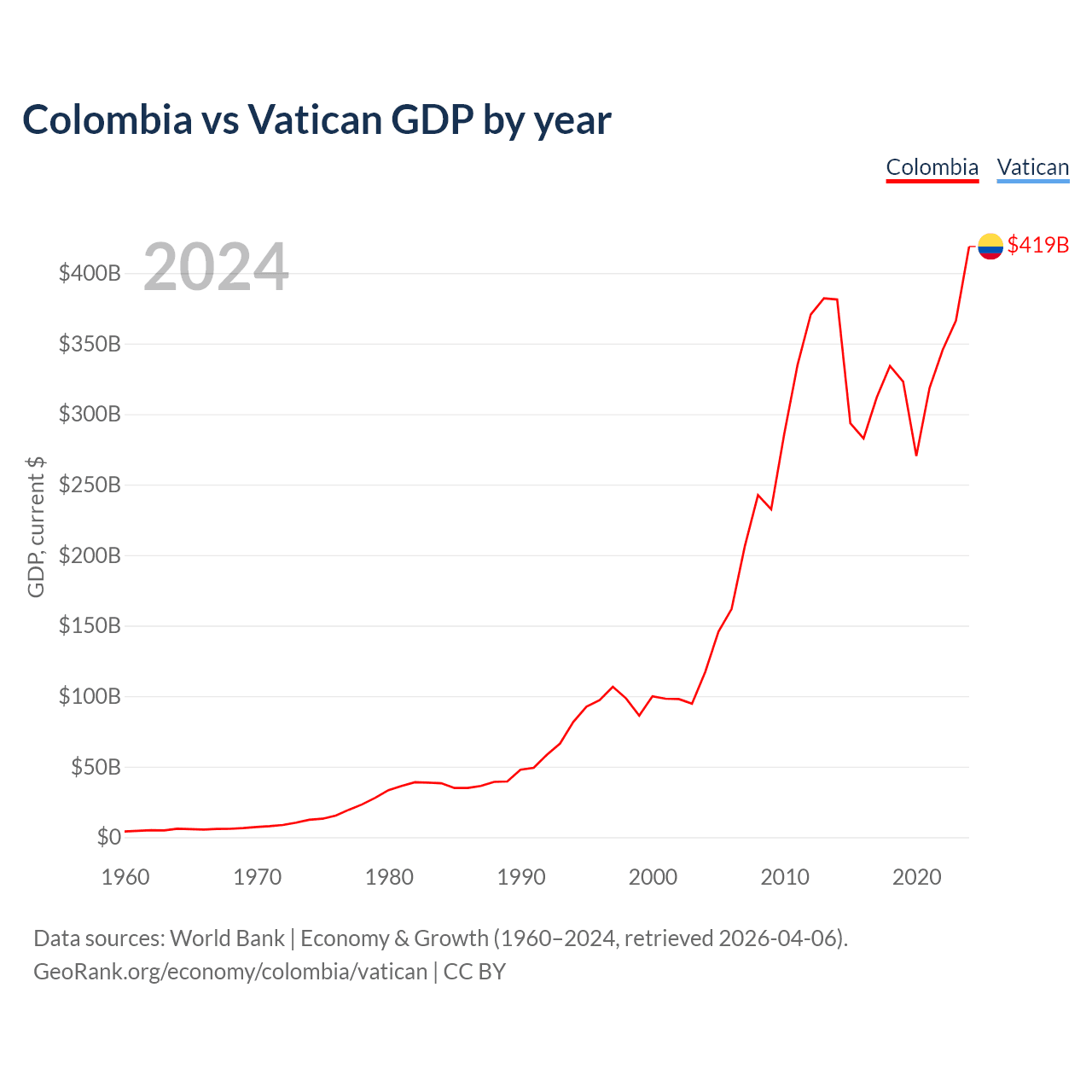 Colombia has a GDP of $419B compared to $19.8M for the Vatican, ranking 39/197 and 197/197 by economy size, respectively.
