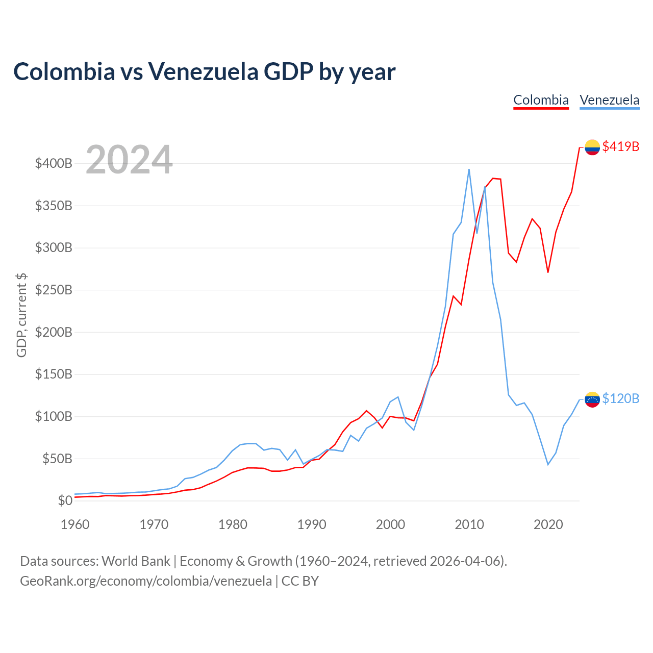 Colombia vs Venezuela GDP by year
