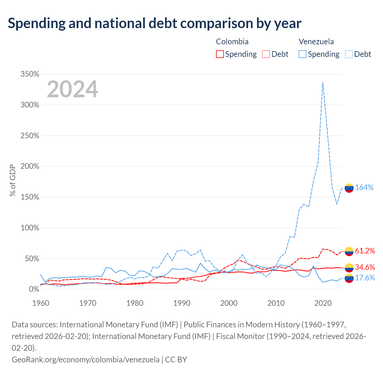 Colombia has $256B in government debt (61.2% of GDP), compared to $197B (164.3% of GDP) in Venezuela.