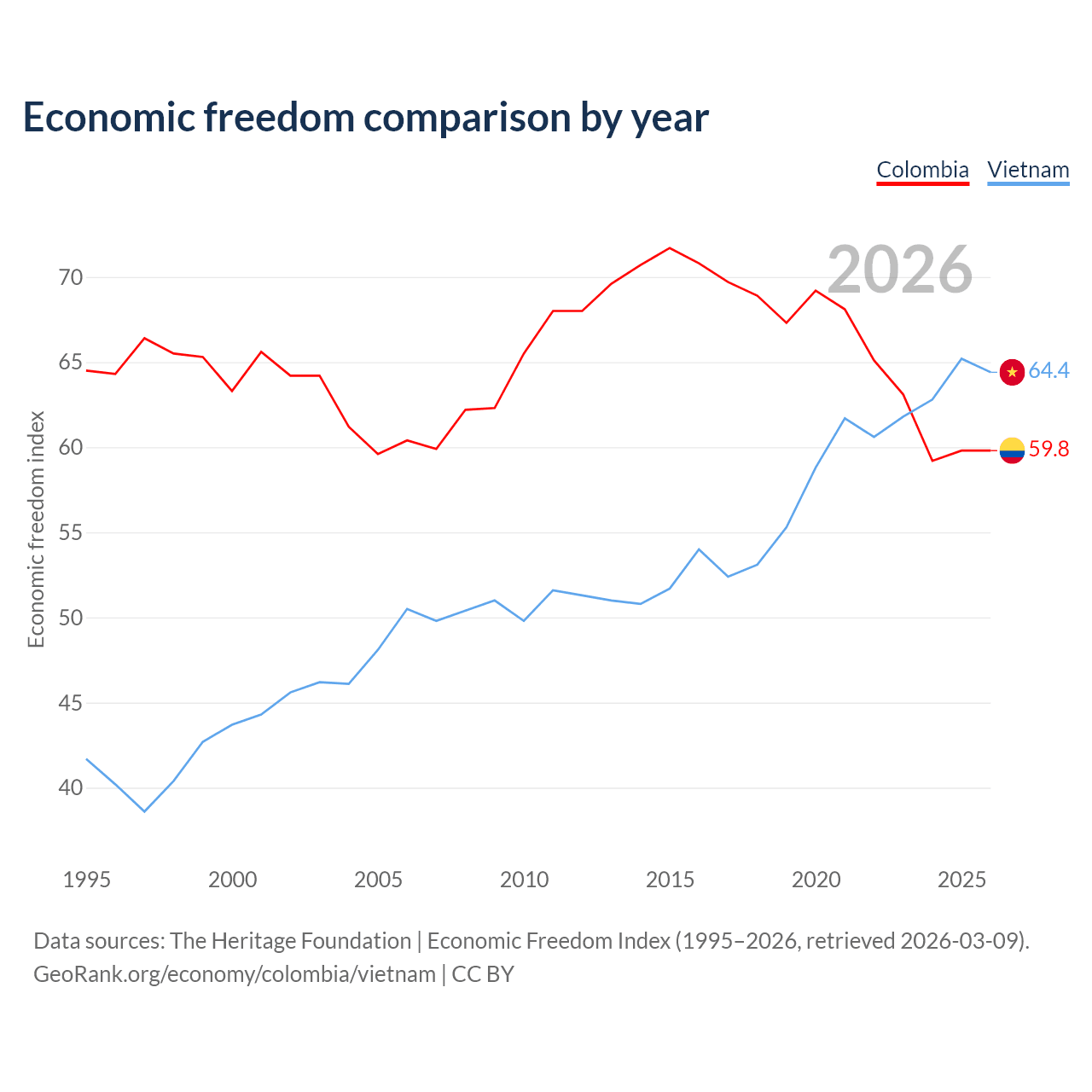 The Economic Freedom Index for Colombia is 59.8, ranking 101/197, compared to 64.4 for Vietnam, ranking 73/197. The chart above displays a comparison of annual changes in economic freedom indexes.