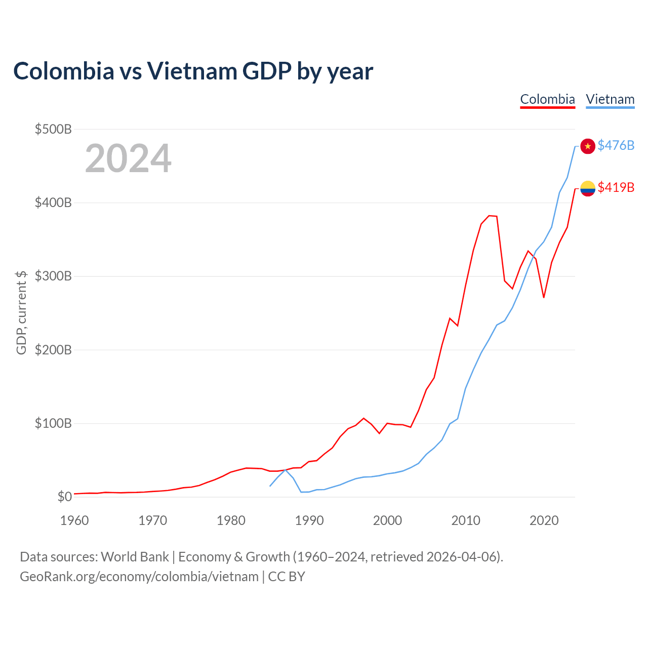 Colombia has a GDP of $419B compared to $476B for Vietnam, ranking 39/197 and 33/197 by economy size, respectively.