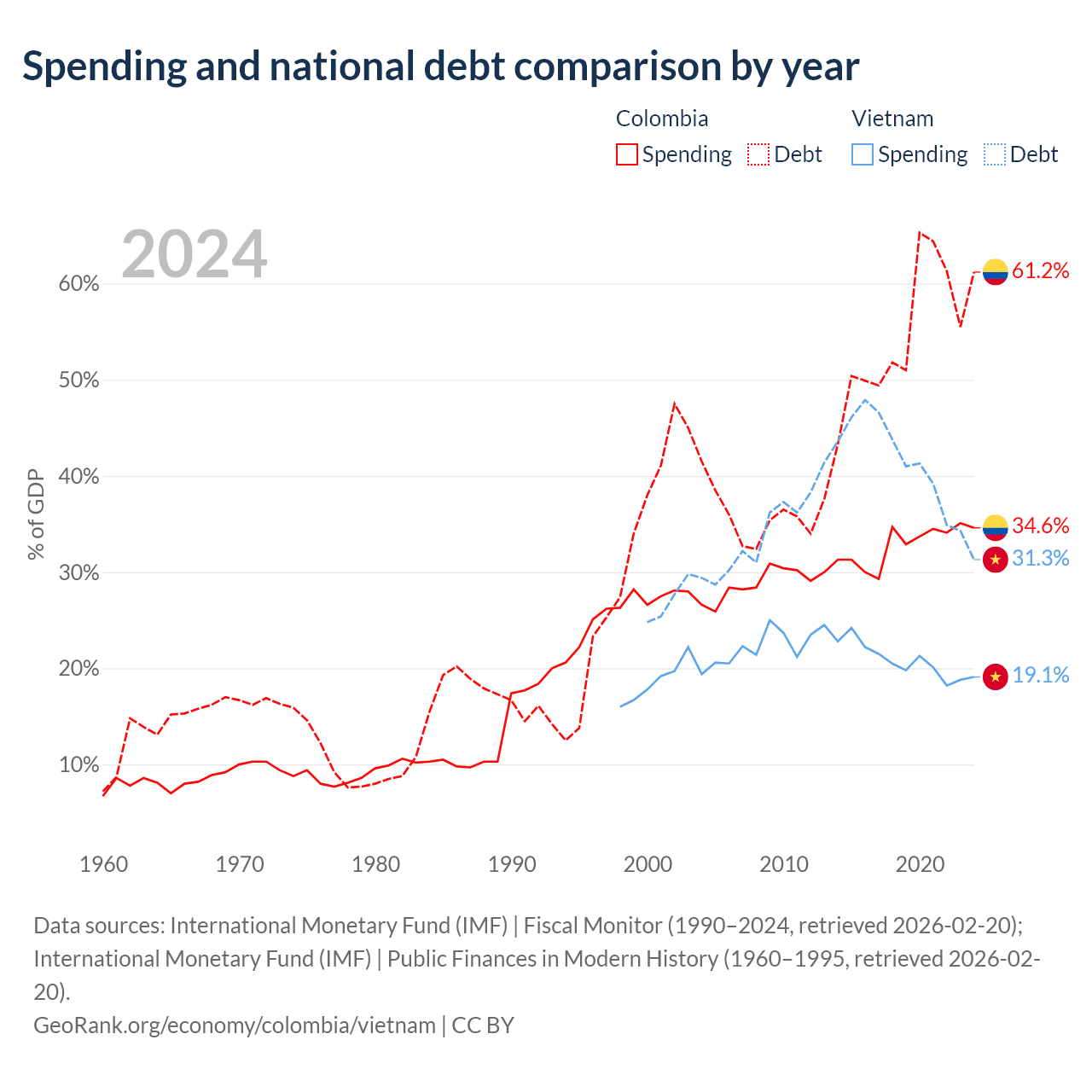 Colombia has $256B in government debt (61.2% of GDP), compared to $149B (31.3% of GDP) in Vietnam.