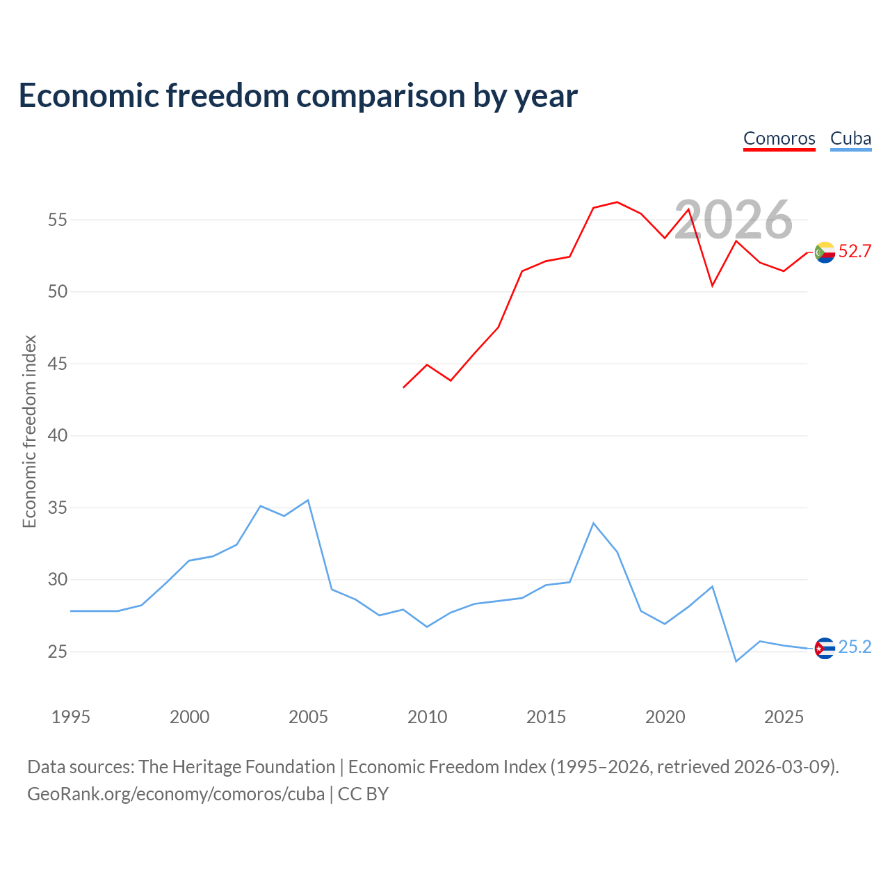 The Economic Freedom Index for Comoros is 52.7, ranking 145/197, compared to 25.2 for Cuba, ranking 195/197. The chart above displays a comparison of annual changes in economic freedom indexes.