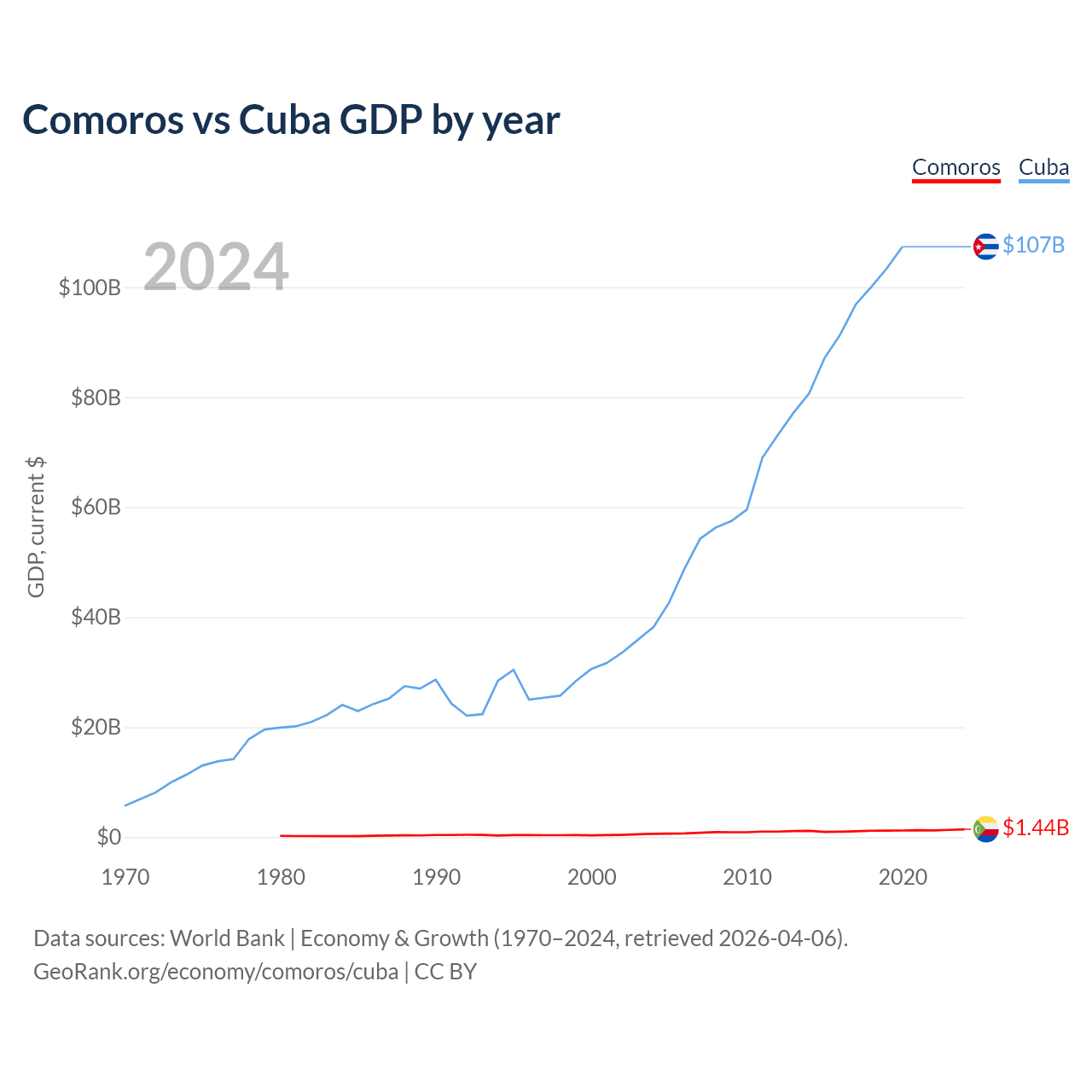 Comoros has a GDP of $1.44B compared to $107B for Cuba, ranking 183/197 and 69/197 by economy size, respectively.
