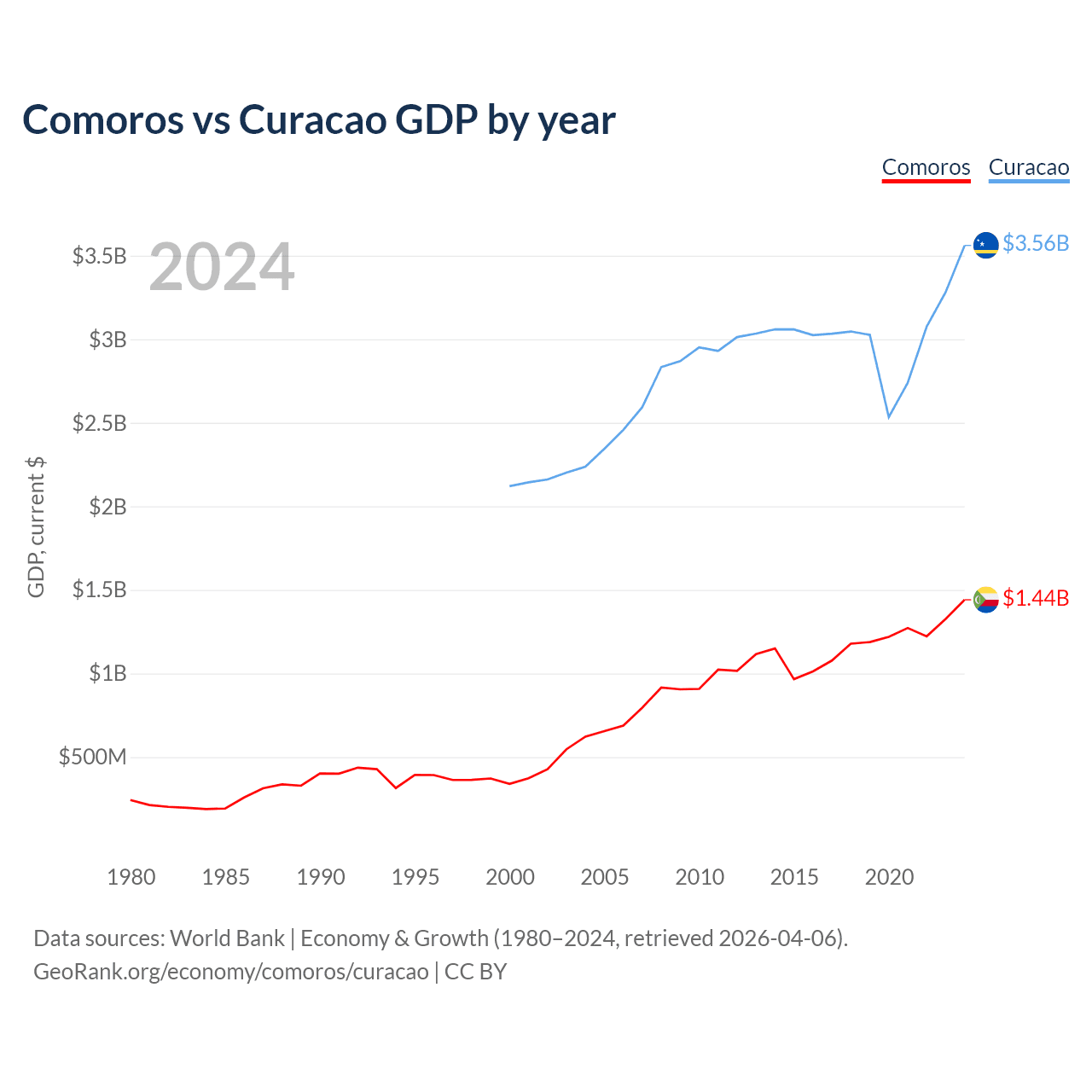 Comoros has a GDP of $1.44B compared to $3.56B for Curacao, ranking 183/197 and 167/197 by economy size, respectively.