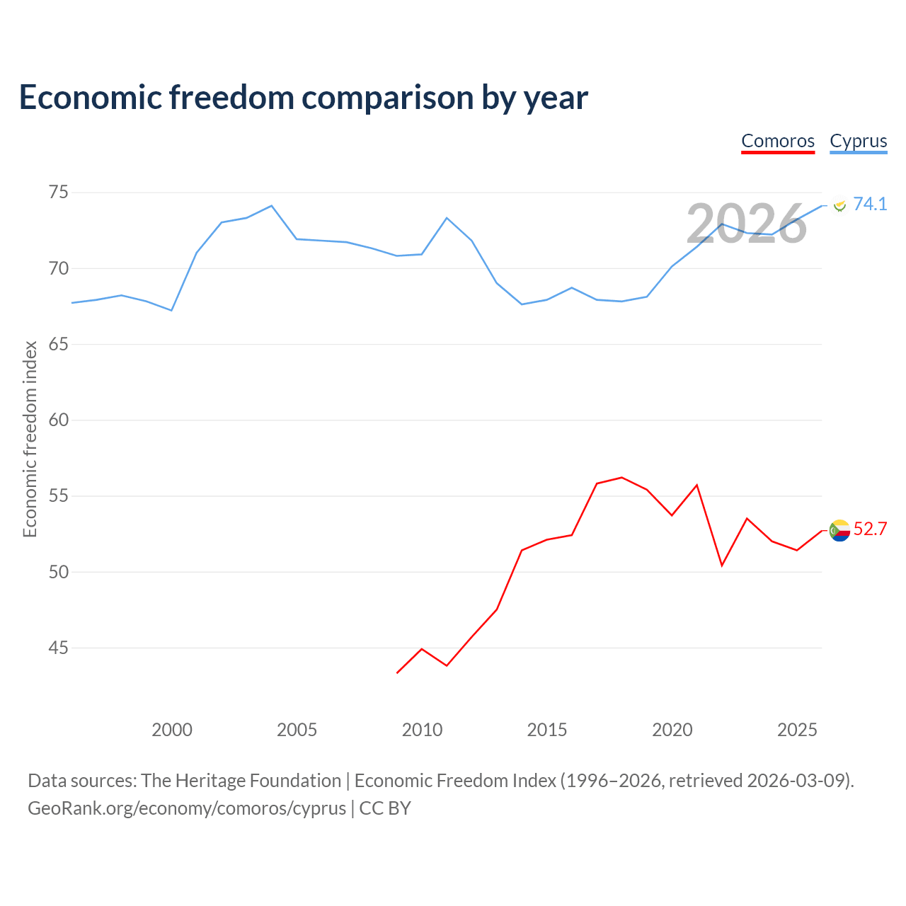 The Economic Freedom Index for Comoros is 52.7, ranking 145/197, compared to 74.1 for Cyprus, ranking 21/197. The chart above displays a comparison of annual changes in economic freedom indexes.