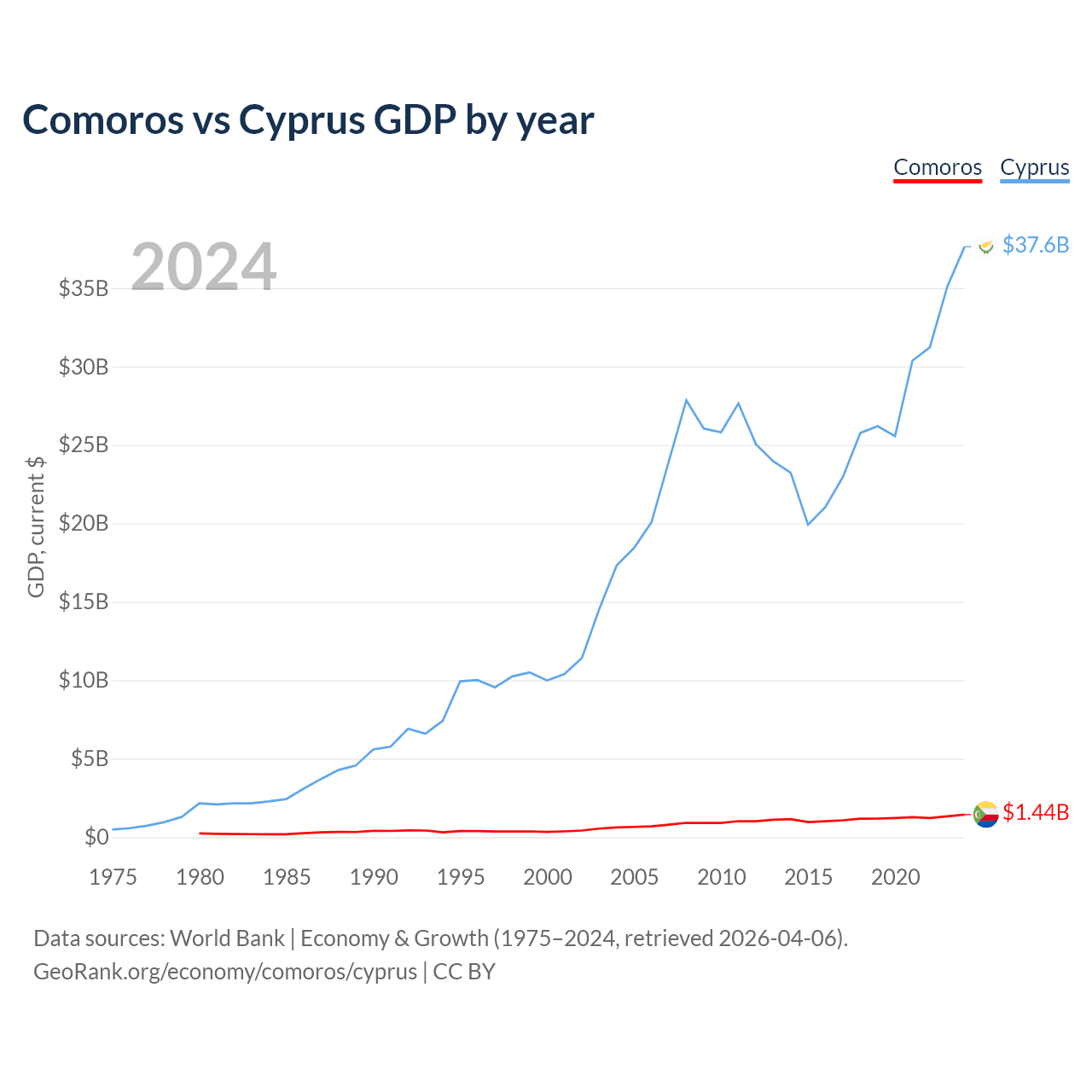 Comoros has a GDP of $1.44B compared to $37.6B for Cyprus, ranking 183/197 and 103/197 by economy size, respectively.