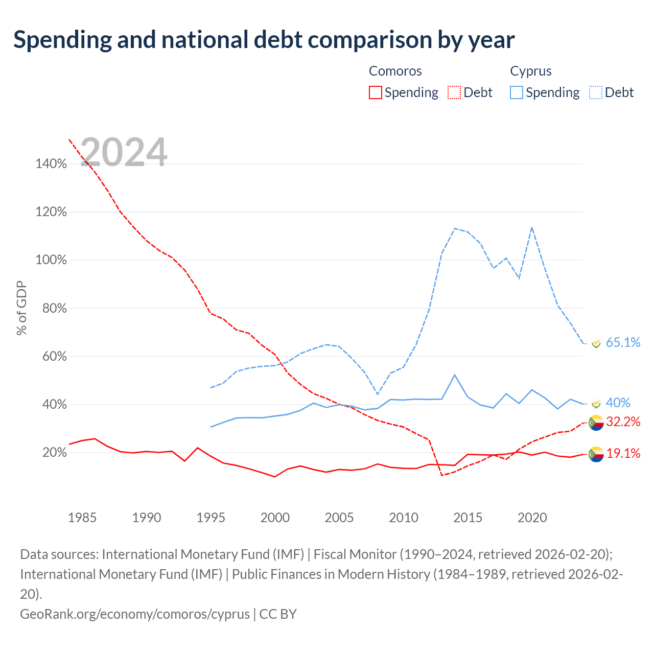 Comoros has $463M in government debt (32.2% of GDP), compared to $24.5B (65.1% of GDP) in Cyprus.