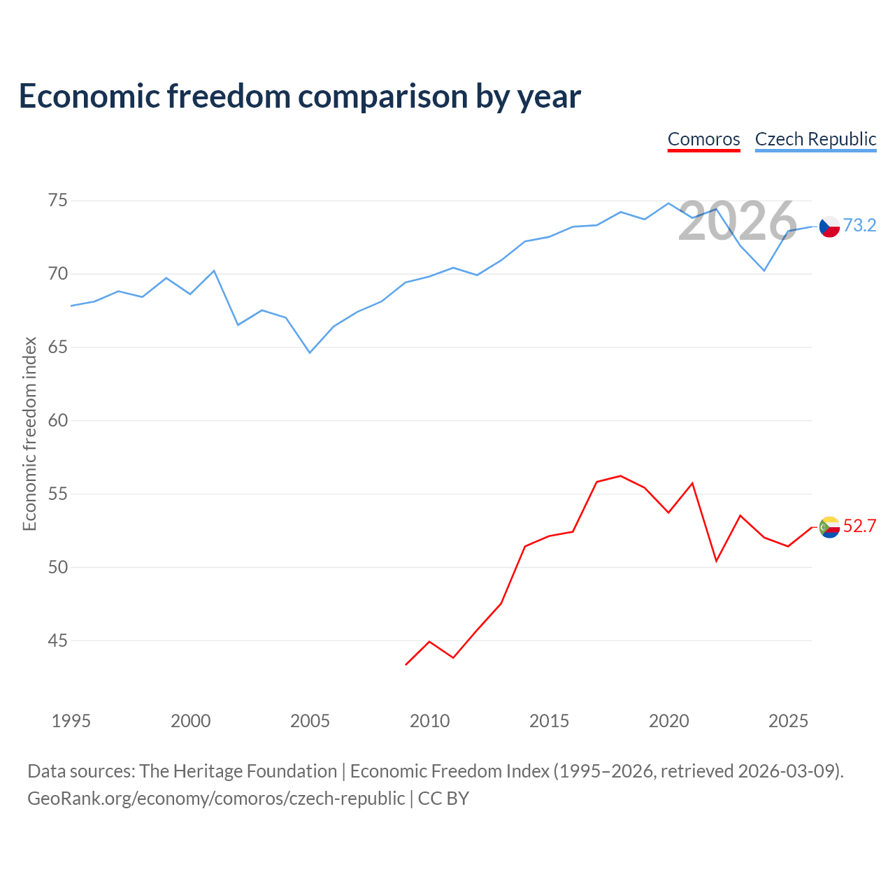 The Economic Freedom Index for Comoros is 52.7, ranking 145/197, compared to 73.2 for the Czech Republic, ranking 25/197. The chart above displays a comparison of annual changes in economic freedom indexes.