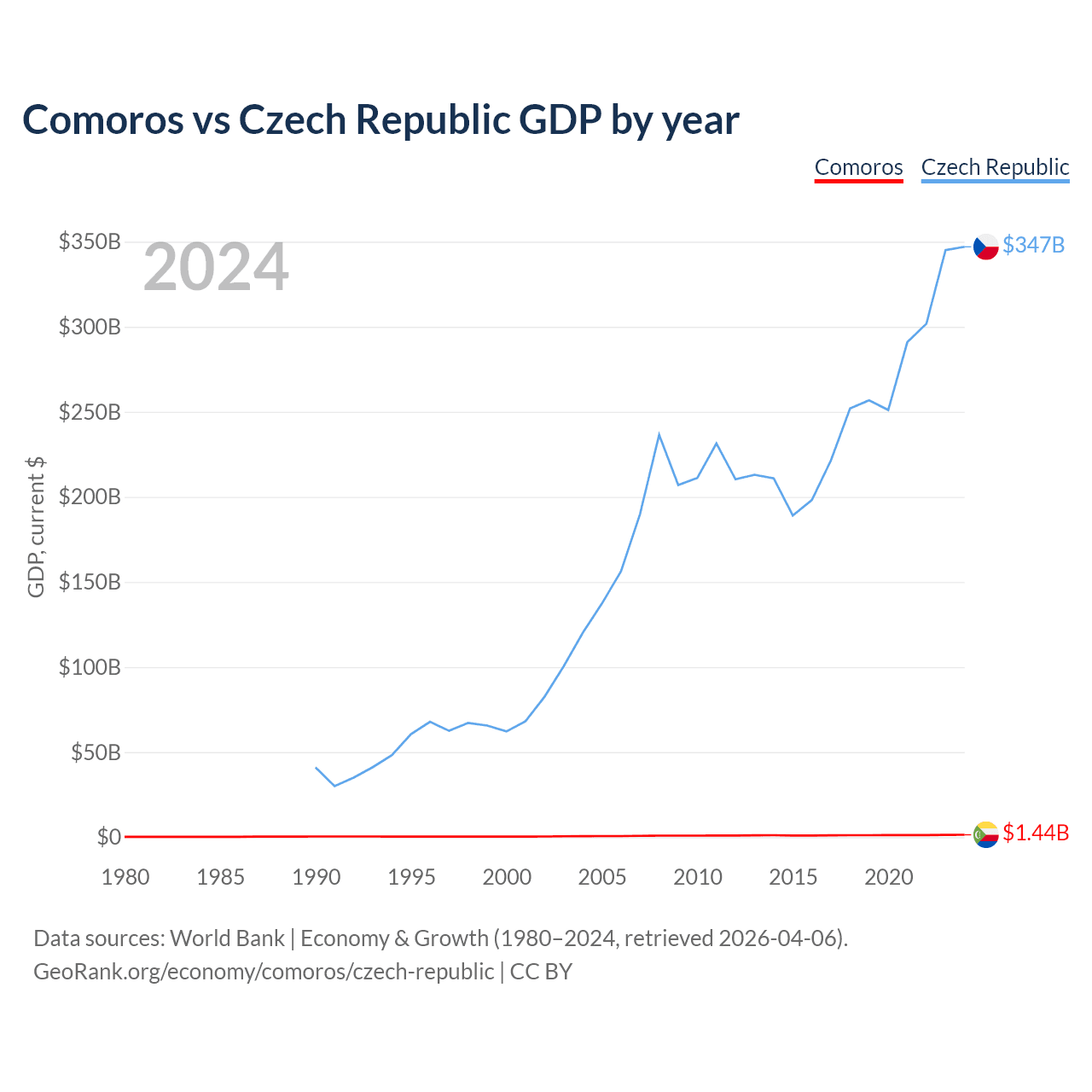 Comoros has a GDP of $1.44B compared to $347B for the Czech Republic, ranking 183/197 and 44/197 by economy size, respectively.