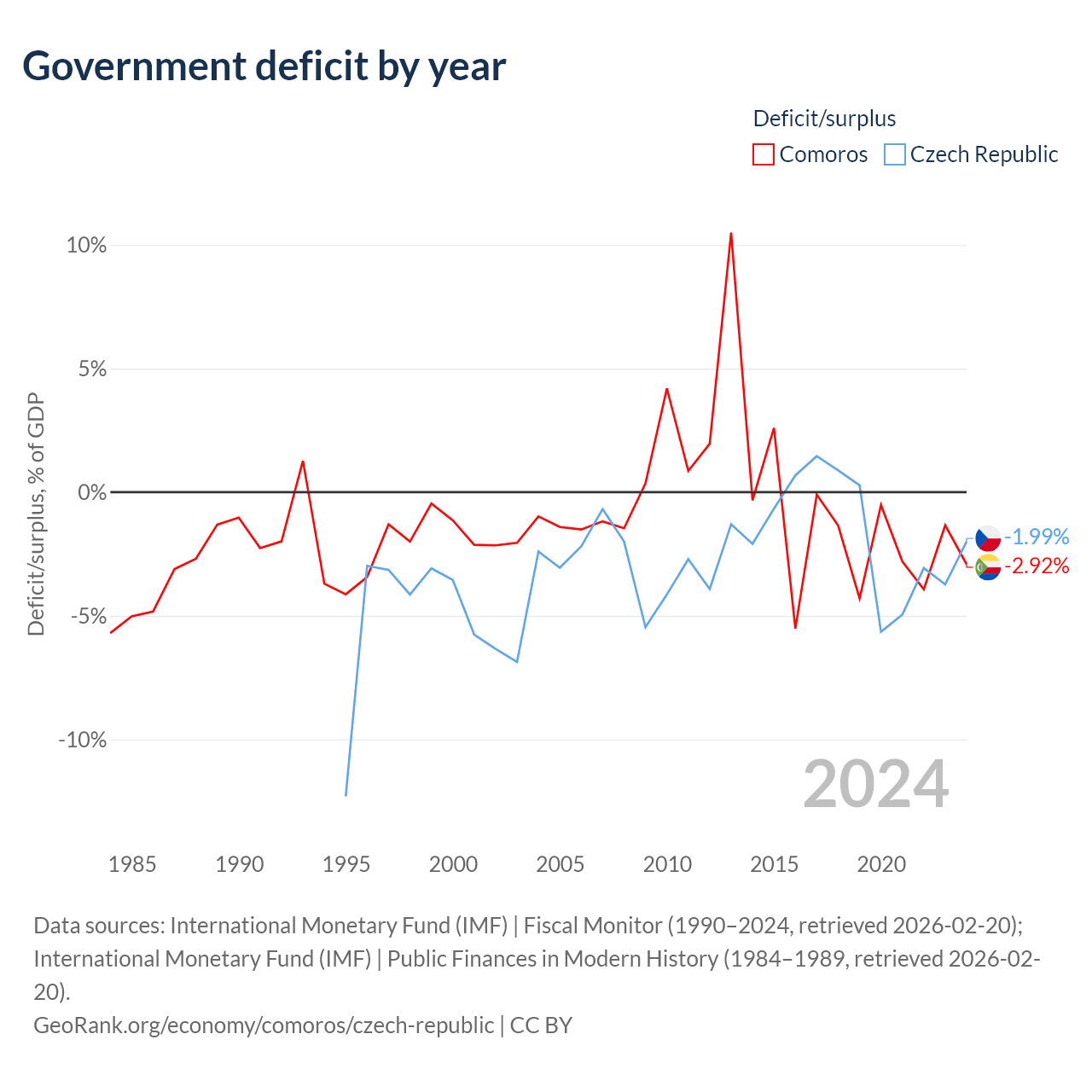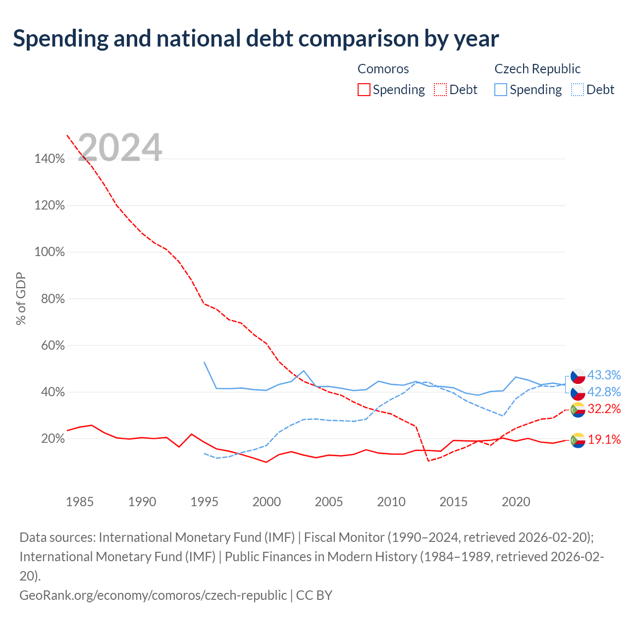 Comoros has $463M in government debt (32.2% of GDP), compared to $150B (43.3% of GDP) in the Czech Republic.
