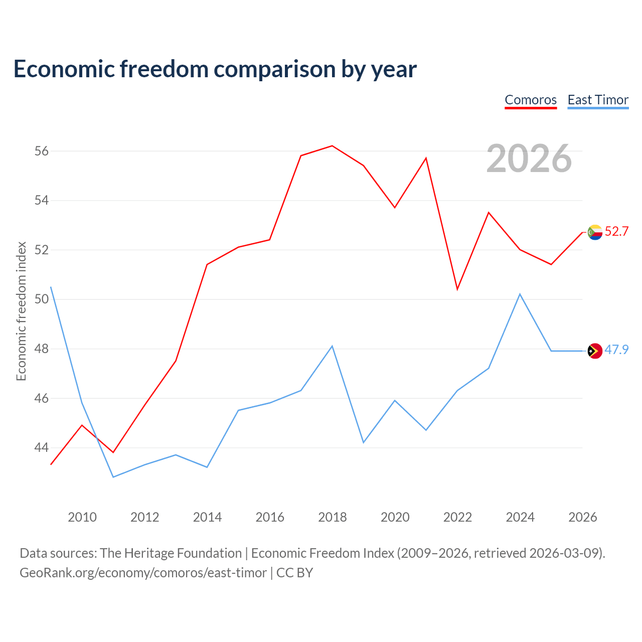 The Economic Freedom Index for Comoros is 52.7, ranking 145/197, compared to 47.9 for East Timor, ranking 173/197. The chart above displays a comparison of annual changes in economic freedom indexes.