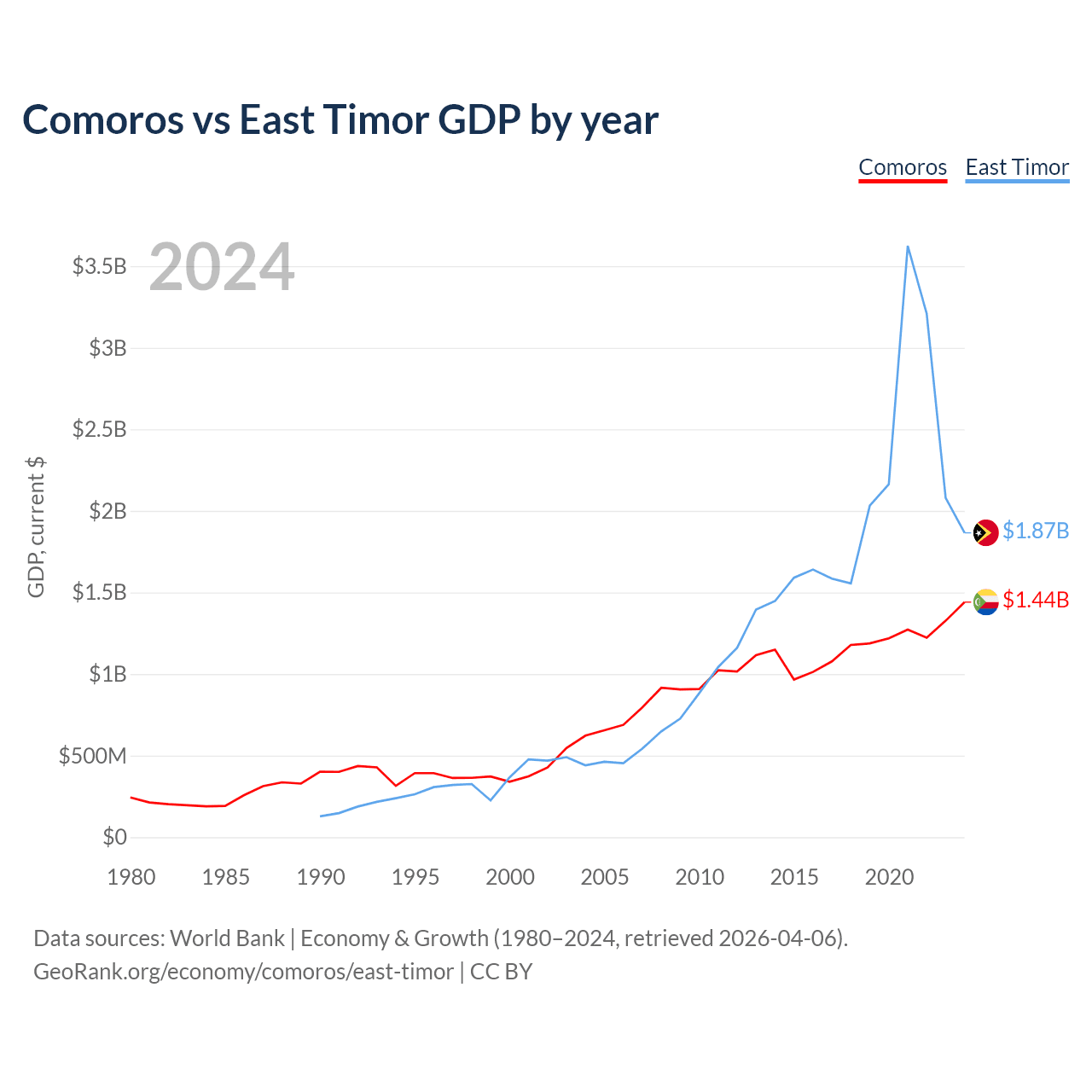 Comoros has a GDP of $1.44B compared to $1.87B for East Timor, ranking 183/197 and 181/197 by economy size, respectively.