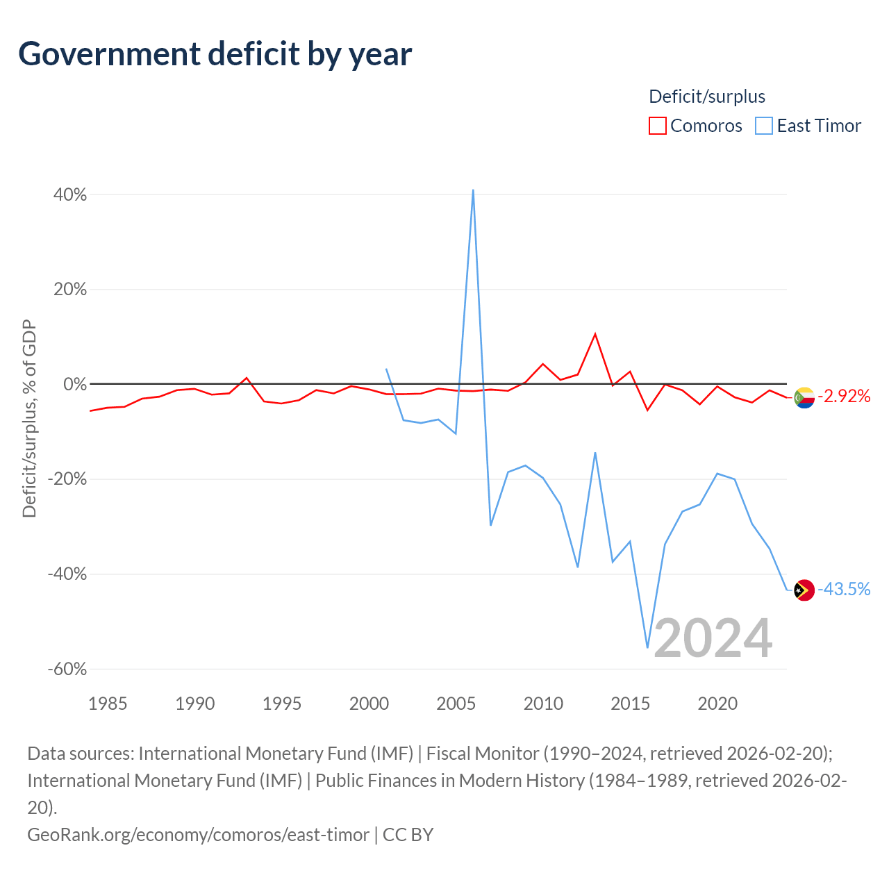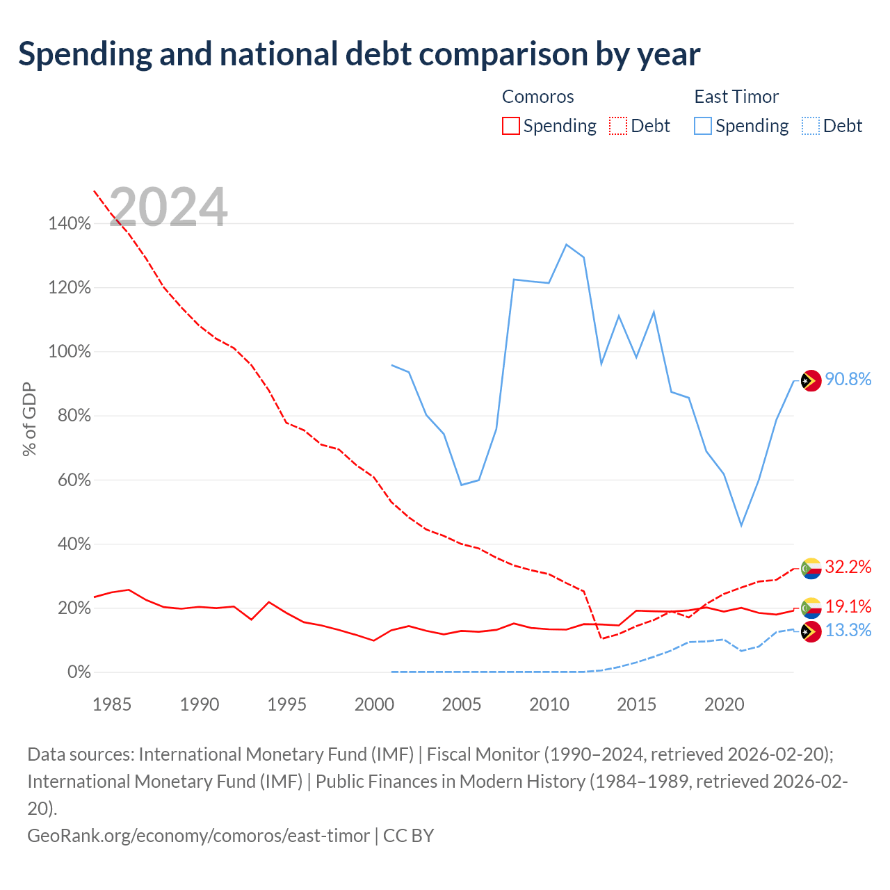 Comoros has $463M in government debt (32.2% of GDP), compared to $249M (13.3% of GDP) in East Timor.