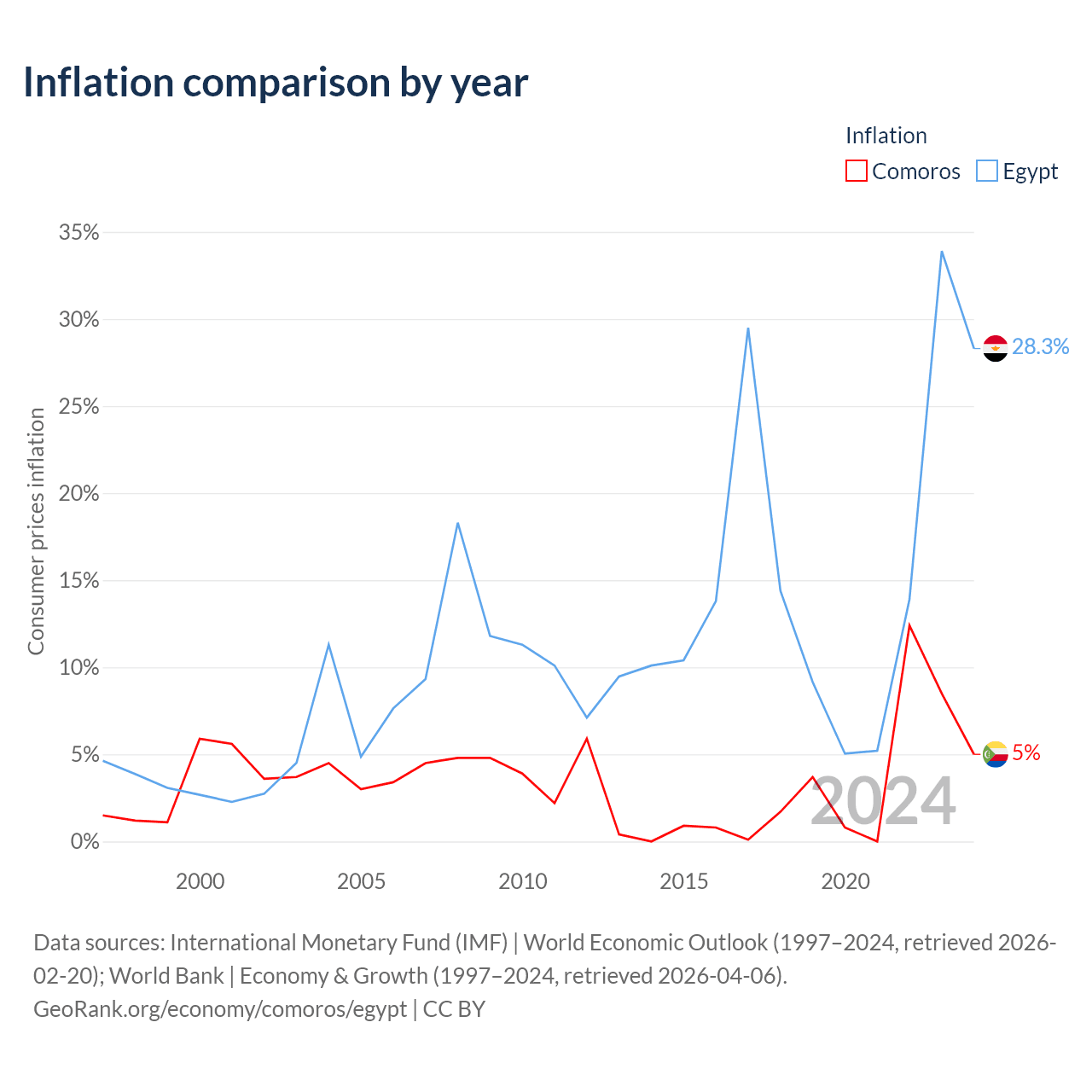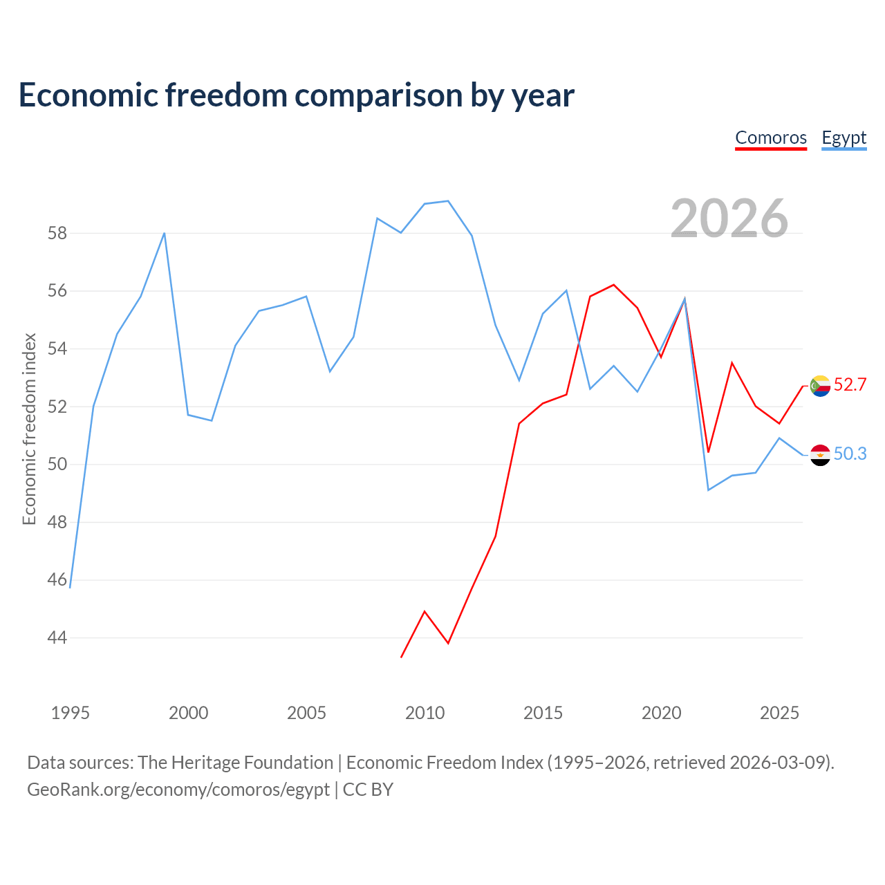 The Economic Freedom Index for Comoros is 52.7, ranking 145/197, compared to 50.3 for Egypt, ranking 160/197. The chart above displays a comparison of annual changes in economic freedom indexes.