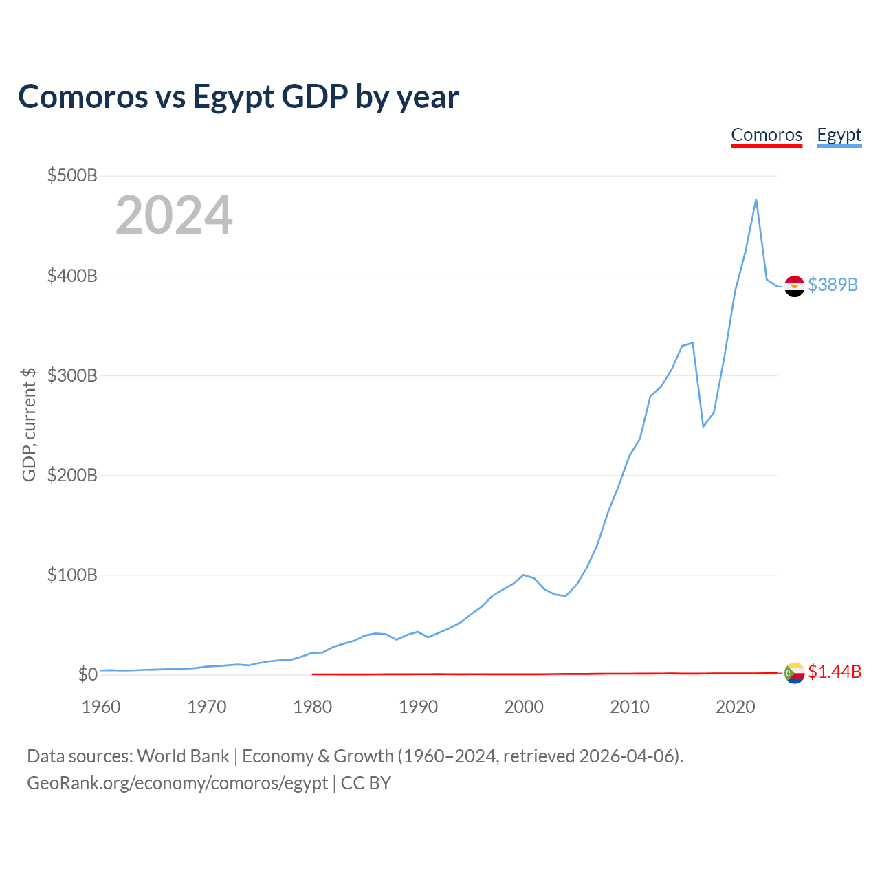 Comoros has a GDP of $1.44B compared to $389B for Egypt, ranking 183/197 and 41/197 by economy size, respectively.